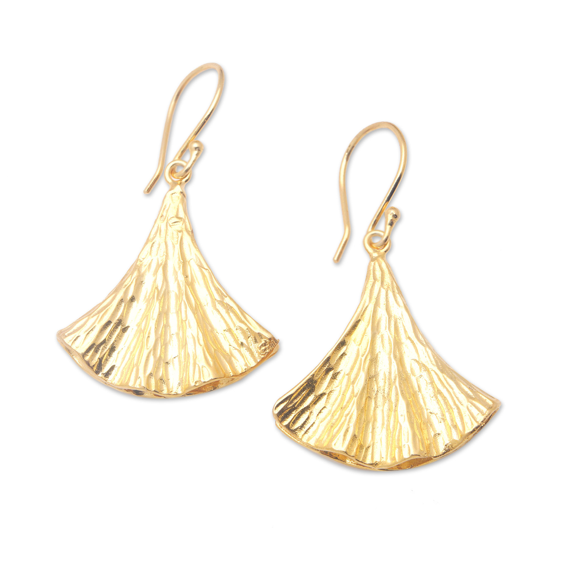 Windy formations add a magical illusion to these fan-shaped dangle earrings crafted by Bali's Dewa Nyoman Oka. After adding hammered details to the accessory, the artisan joins these 18k gold-plated brass pendants to comfortable hooks that will allow you to wear them gracefully.