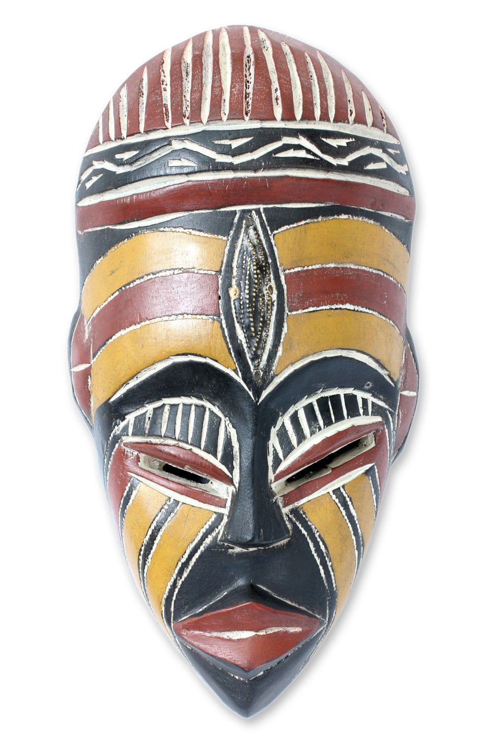 The bright design of this West African mask augurs a good morning or walizam in the Fulani language. Abdul Aziz Mohamadu creates this original design, carving the sese wood mask by hand and finishing it with painted details and a brass decorative motif.