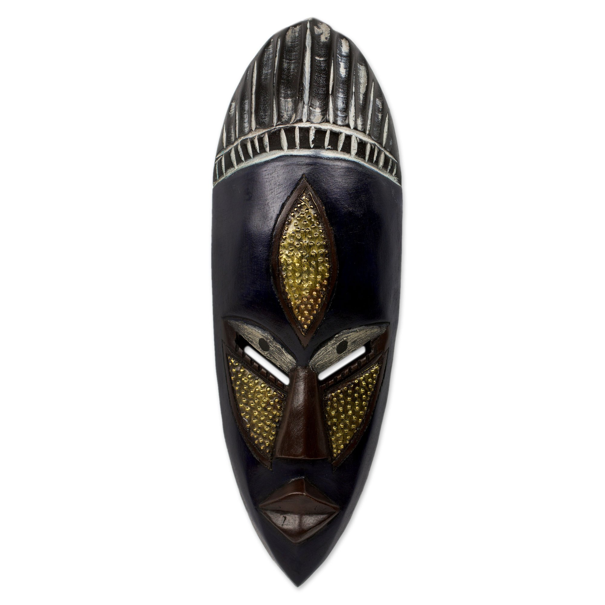 Embossed brass adorns the features of an imposing African mask. By Awudu Saaed, it depicts a fetish priest of the Densu River area in Ghana's Akan lowlands. "There was once a lack of rainfall for a long period and the people became worried," he says. "They called for a fetish priest who consulted the gods on behalf of the chiefs and people. He requested certain rituals, after which the heavens would open to give rain. The priest wore this mask to perform the rituals and, true to his word, it rained heavily on the third day."