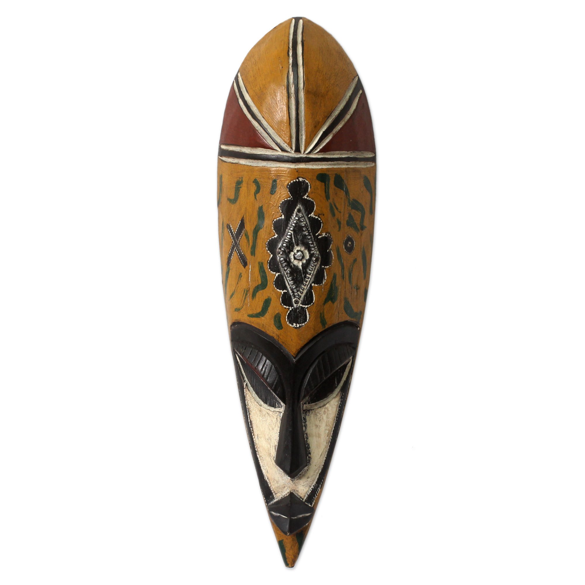 A stately beauty pervades a mask with innate dignity. Regal yet not imperious, a beautiful woman wears an ornate repoussé diamond on her forehead. Abdul Aziz Mohamadu transforms native African rubberwood into an African mask of his own design. He names it Osale, meaning "You have a child."