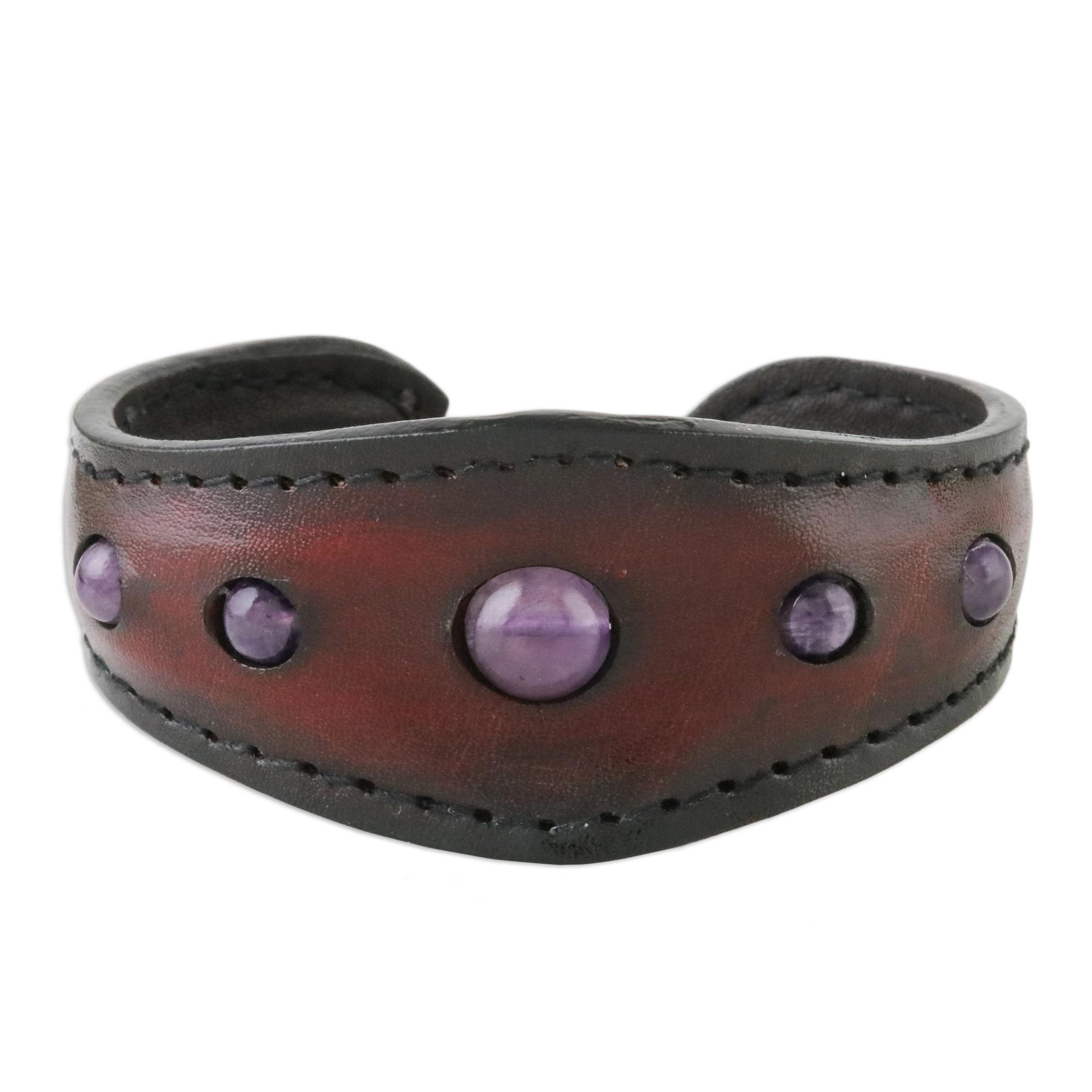 Amethyst and Leather Cuff Bracelet from Thailand, 'The Power'