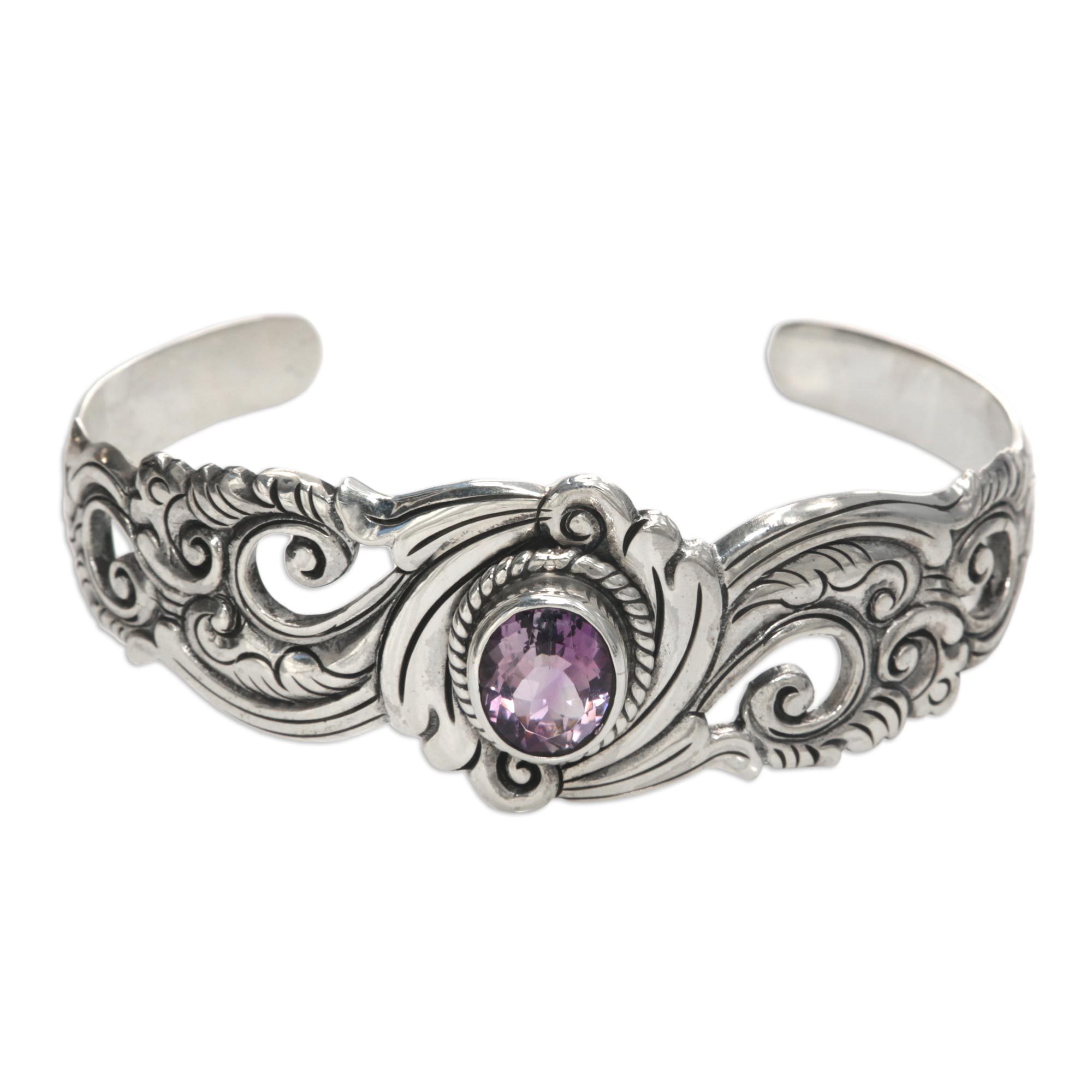 Amethyst and Sterling Silver Cuff Bracelet, 'Regal Ivy'