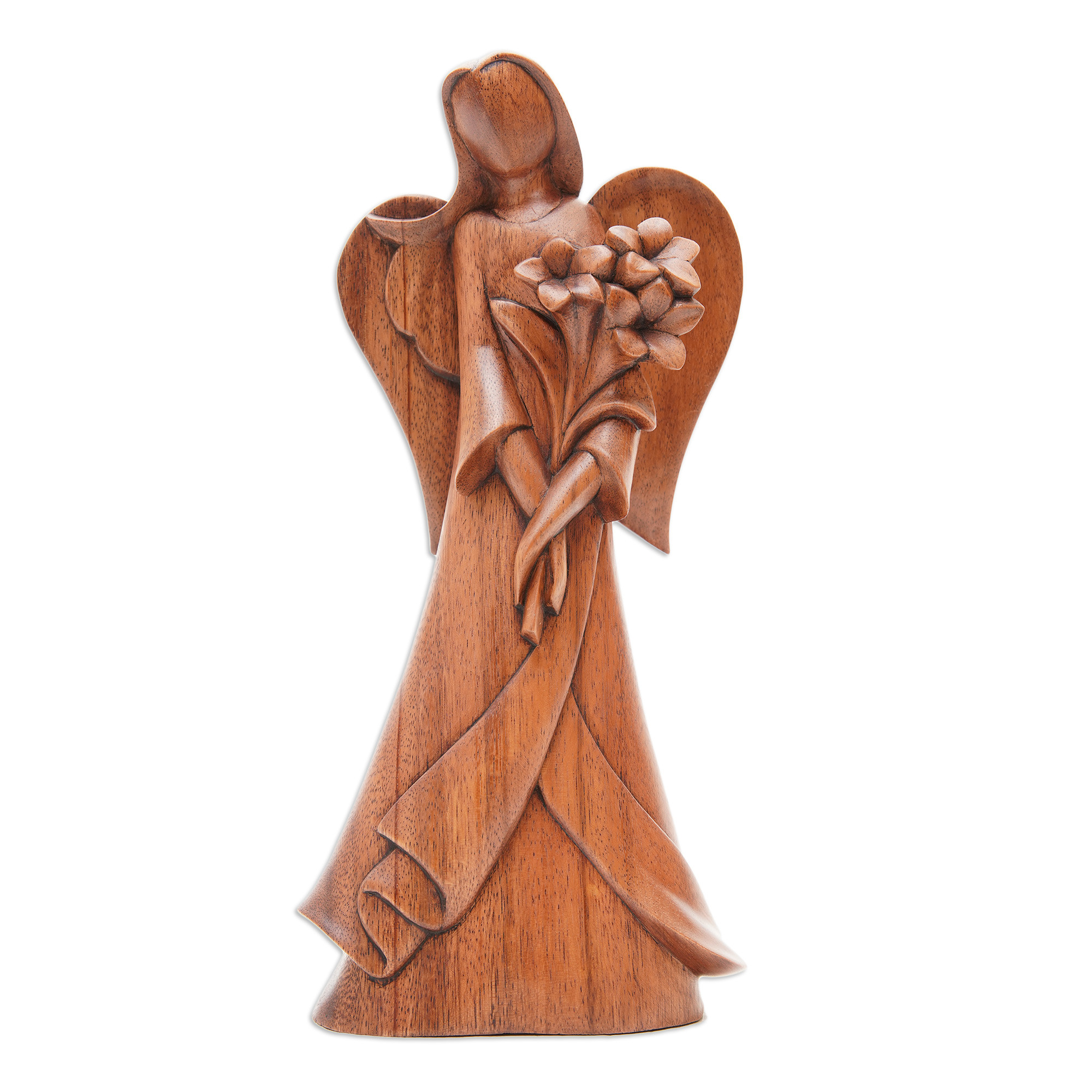 Angel-Themed Floral Suar Wood Sculpture from Bali, 'Valentine Flowers'