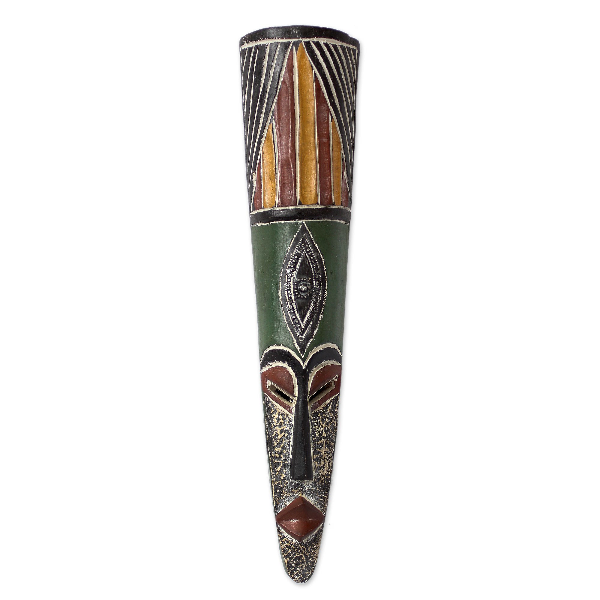 Meaning "Brightness," the Amoo mask from Ghana's Gamashie people is worn for the Homowo festival. The name is Ga in origin and means "hooting at hunger." Held each year in August, it celebrates the corn harvest. Abdul Aziz Mohamadu honors tradition with this African rubberwood replica as he expertly carves it by hand and decorates it with festive colors and embossed aluminum ornamentation.