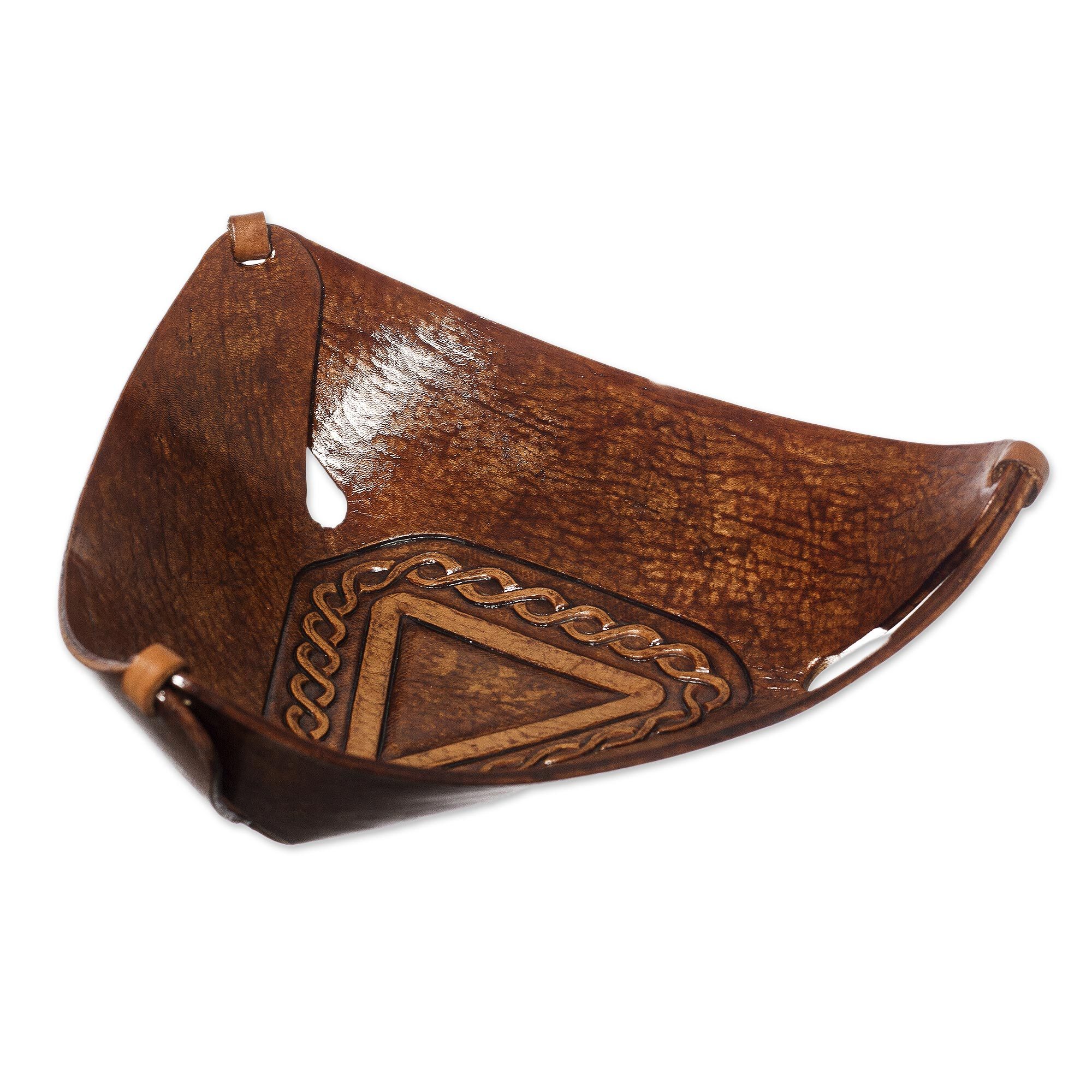 Artisan Crafted Colonial Inspired Tooled Leather Catchall, 'Brown Pyramid Chains'