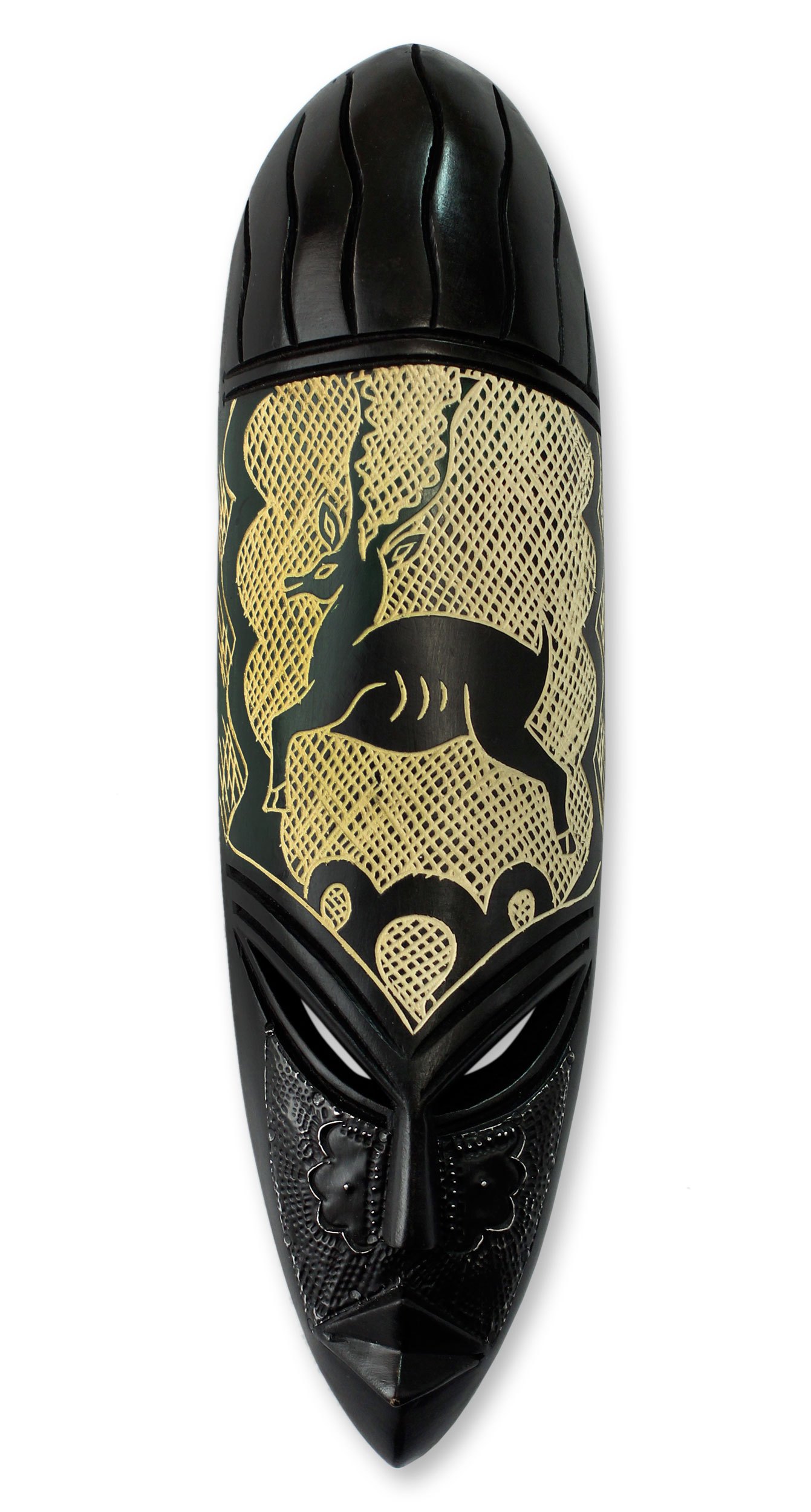A leaping mboloko adorns the forehead of this original mask designed by Awudu Saaed. Meaning 'antelope' in the Lingala language of Congo's Bantu people, the creature is carefully detailed on a hand-carved sese wood mask. Saaed decorates the mask with forest green details and embossed aluminum plates.