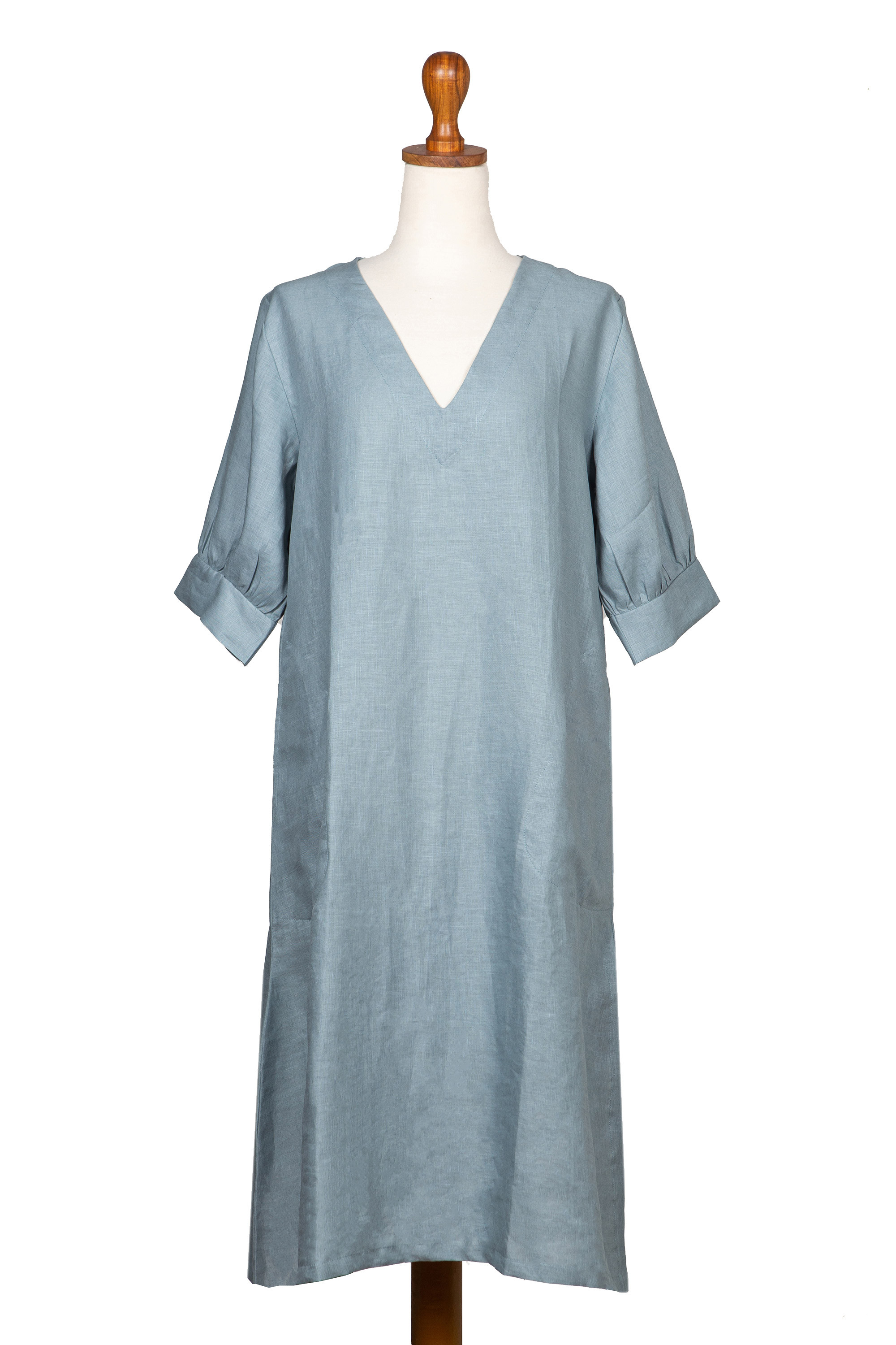 Balinese Blue Linen Tunic Dress with V-Neckline, 'Bright Sunday'