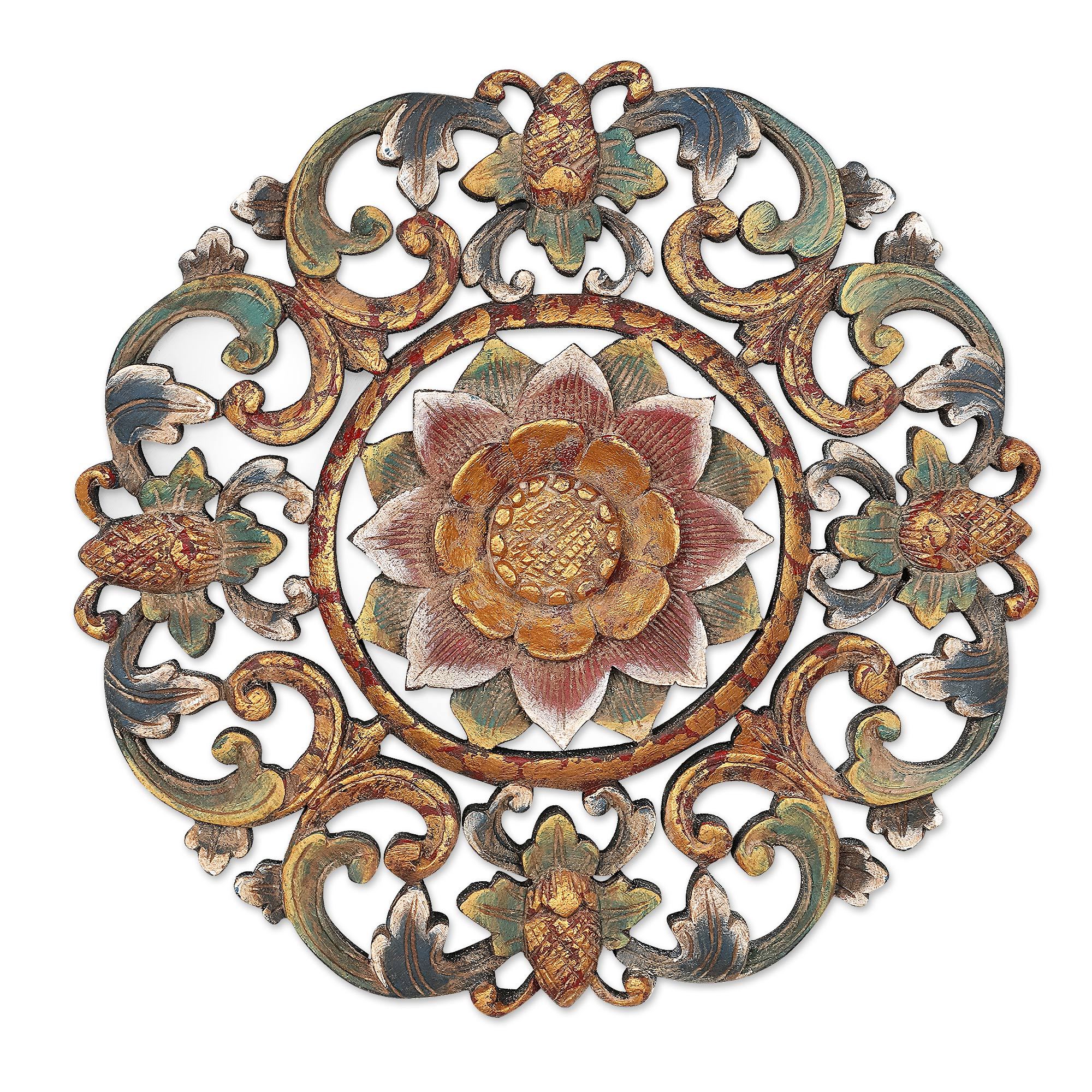 Balinese Hand-Carved & Hand-Painted Lotus Wood Relief Panel, 'Blooming Lotus'