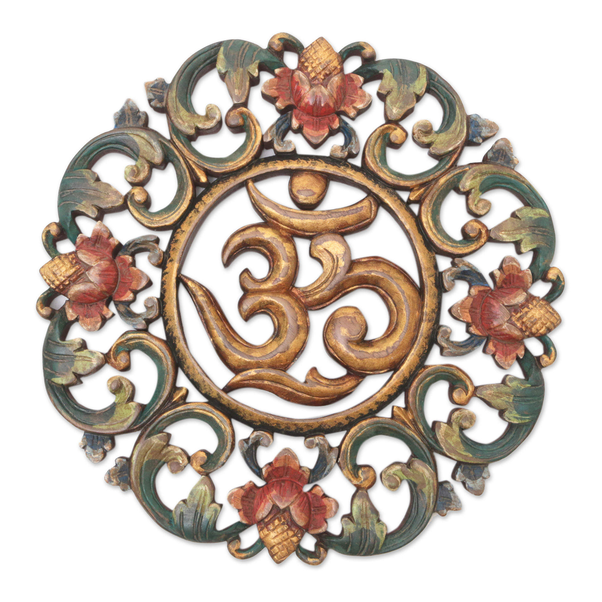 Balinese Hand-Carved and Hand-Painted Om Wood Relief Panel, 'Om Sanctuary'