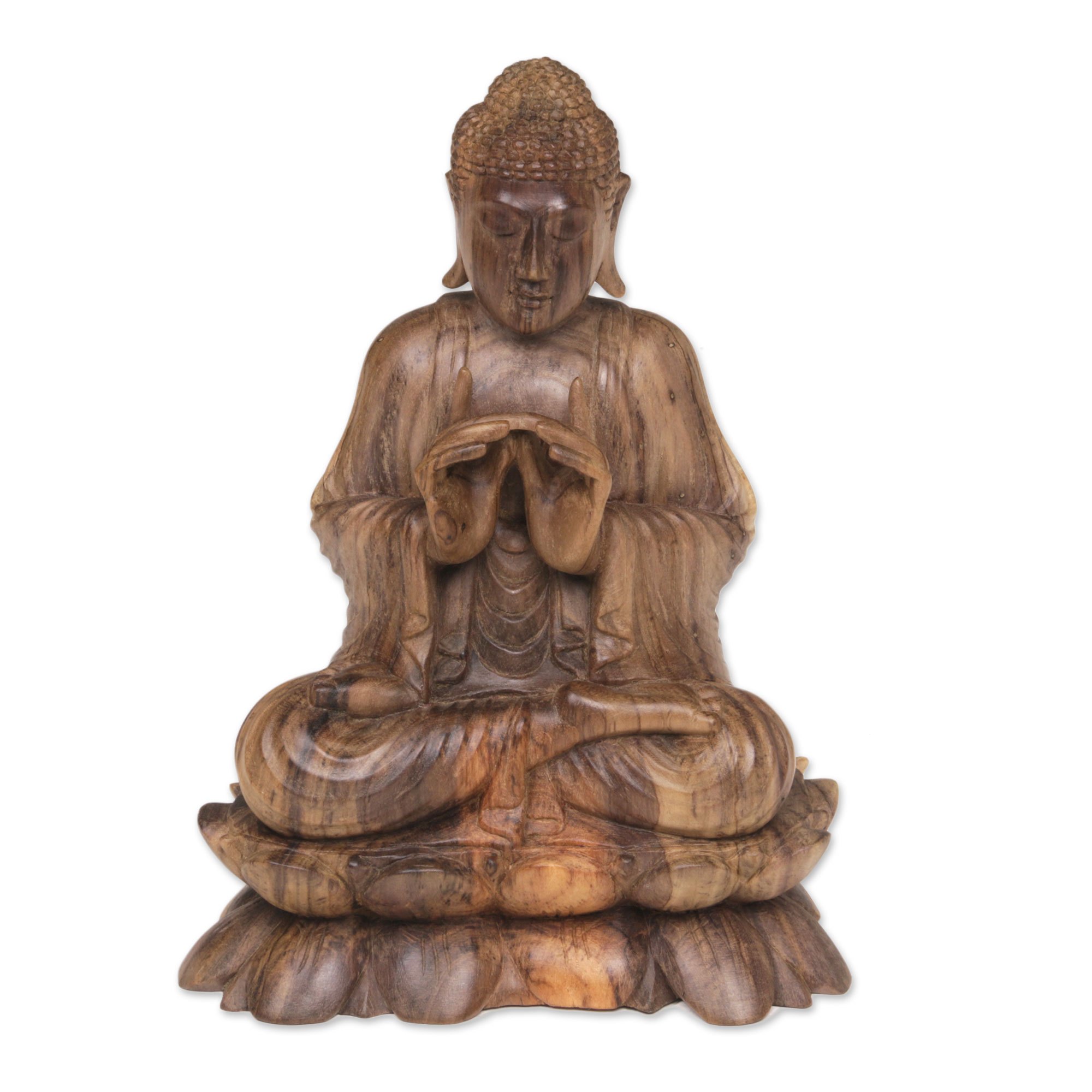 From Bali comes this superb depiction of a teaching Buddha as he sits on sacred lotus flowers, his hands making the gesture which represents the transmission and discussion of his teachings known as the Vitarka mudra. The artisan's skill can be seen in details such as the Buddha's headdress, the drape of his robe and his slender fingers. When designing a new piece, master carver Wayan Rendah enjoys letting the wood's characteristics inspire him. In this case he works with hibiscus wood and finishes the statuette in the variegated brown shades typical of this wood.