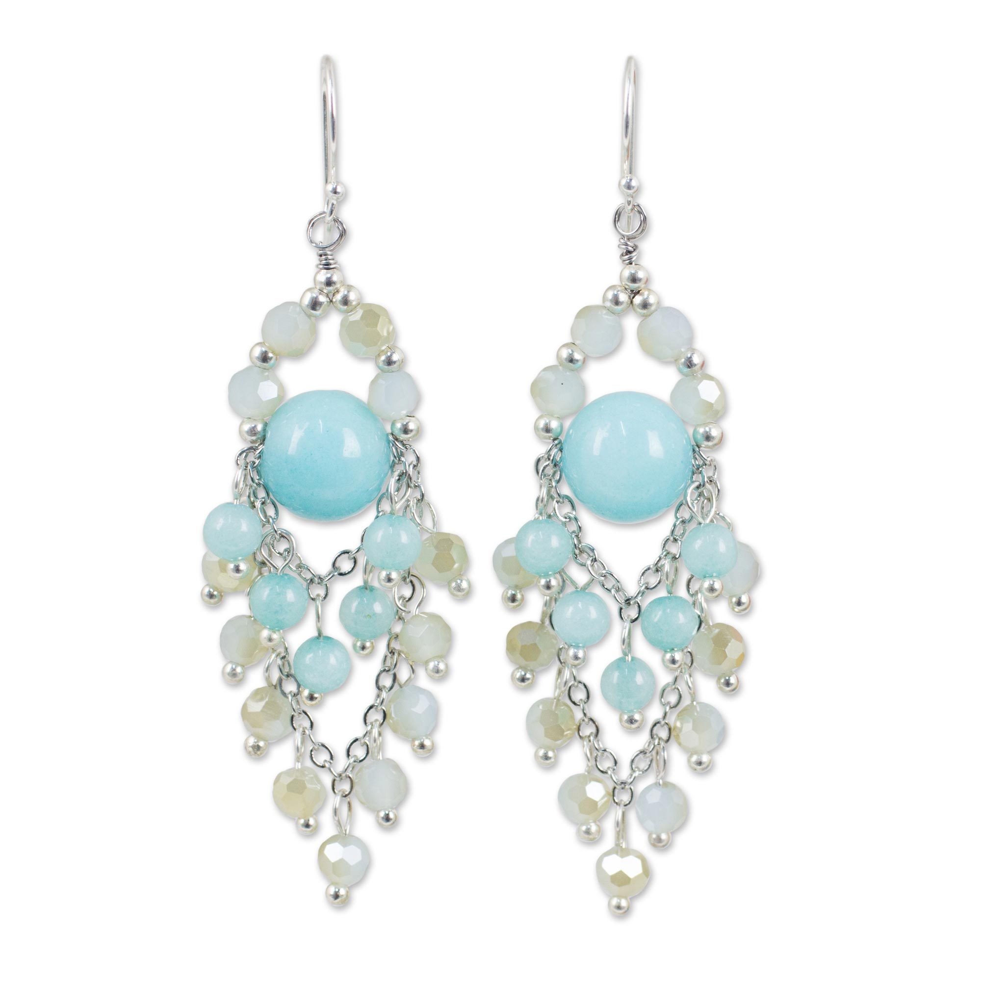 Blazing a brilliant trail, these earrings from Nareerat in Thailand make a sparkling fashion statement. Globes of sky blue quartz are set within tiers of silver chain that suspend sparkling glass beads and additional quartz beads. Silver plated beads add their polished gleam to the effect. The earrings sway from sterling silver hooks.