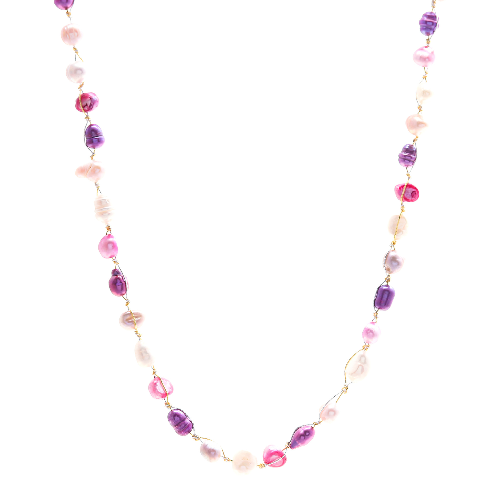 This enchanting cultured pearl necklace captures the essence of a dreamy sunset palette with its gorgeous array of lavender, pink, light grey and white natural pearls. Thailand's Nareerat designs an accessory where potato, semiround and semibaroque pearls dance along silk cords, each one expertly knotted to showcase their unique organic beauty. The sterling silver-plated brass clasp and extender chain offer versatile styling options, allowing you to adjust the length to complement any neckline. Whether worn as a delicate accent for everyday elegance or layered for a more bohemian look, this necklace brings soft, feminine color and timeless sophistication to your jewelry collection.