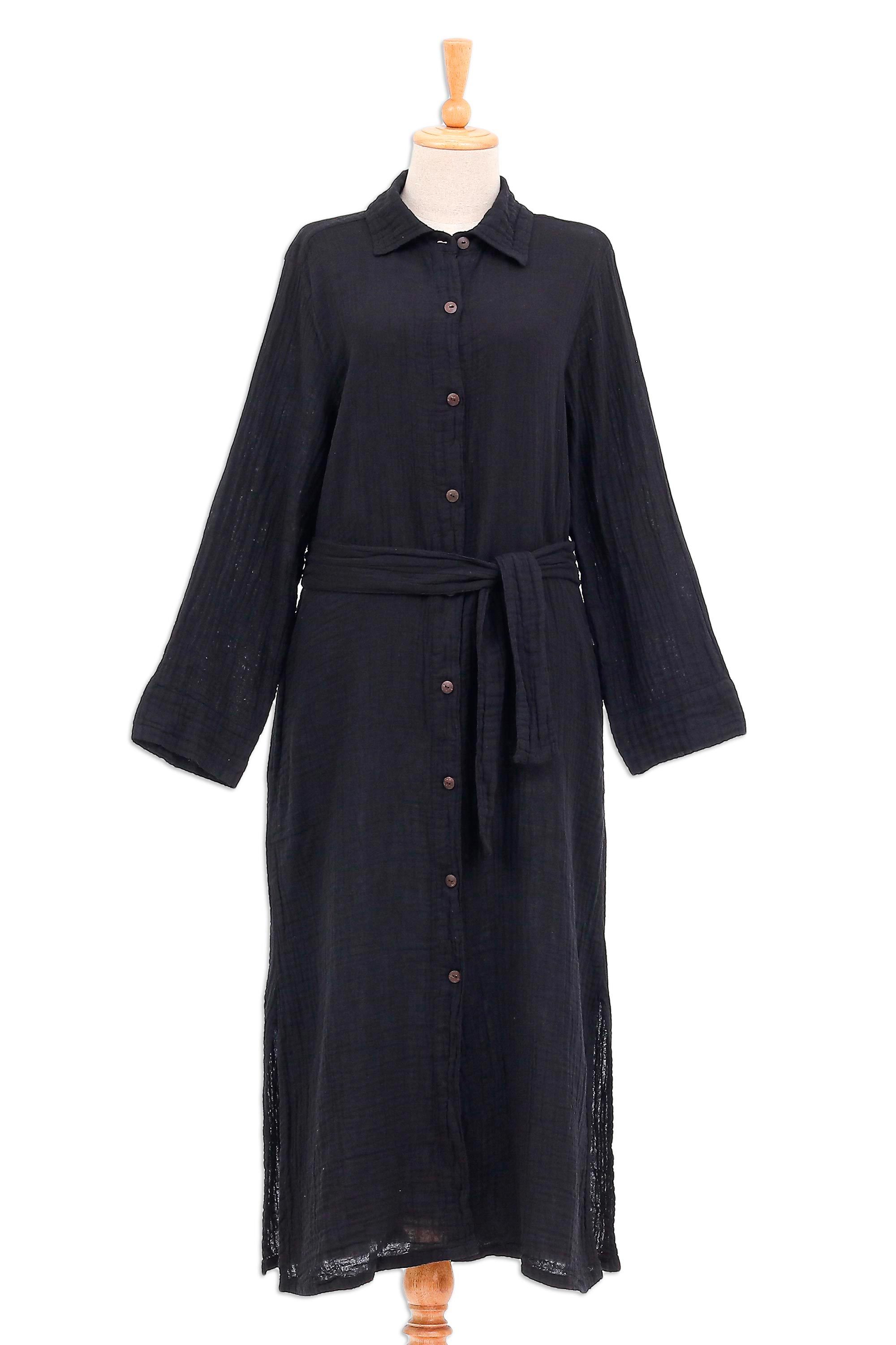 Black Belted Cotton Shirtwaist Dress from Thailand, 'Street Smarts in Black'