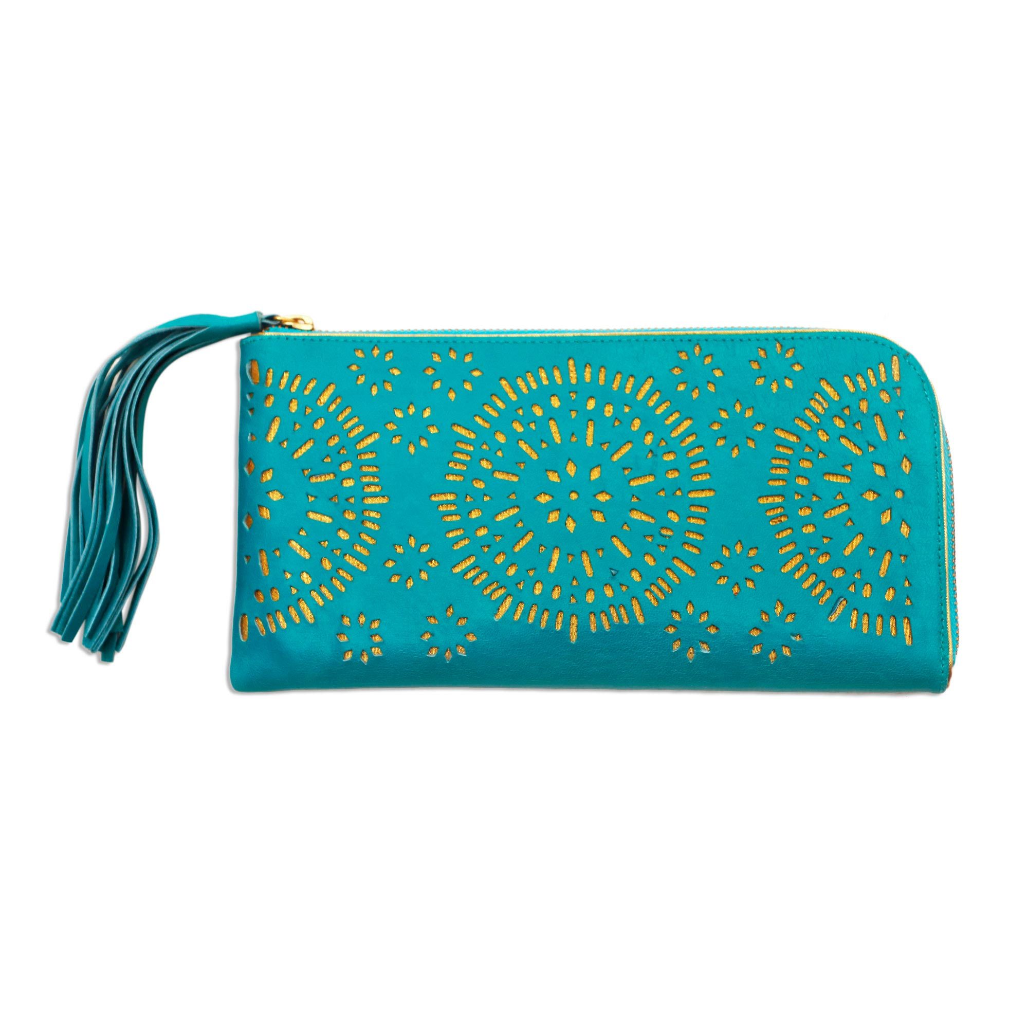 Circle Pattern Leather Clutch in Tosca from Bali, 'Borobudur Stars in Turquoise'