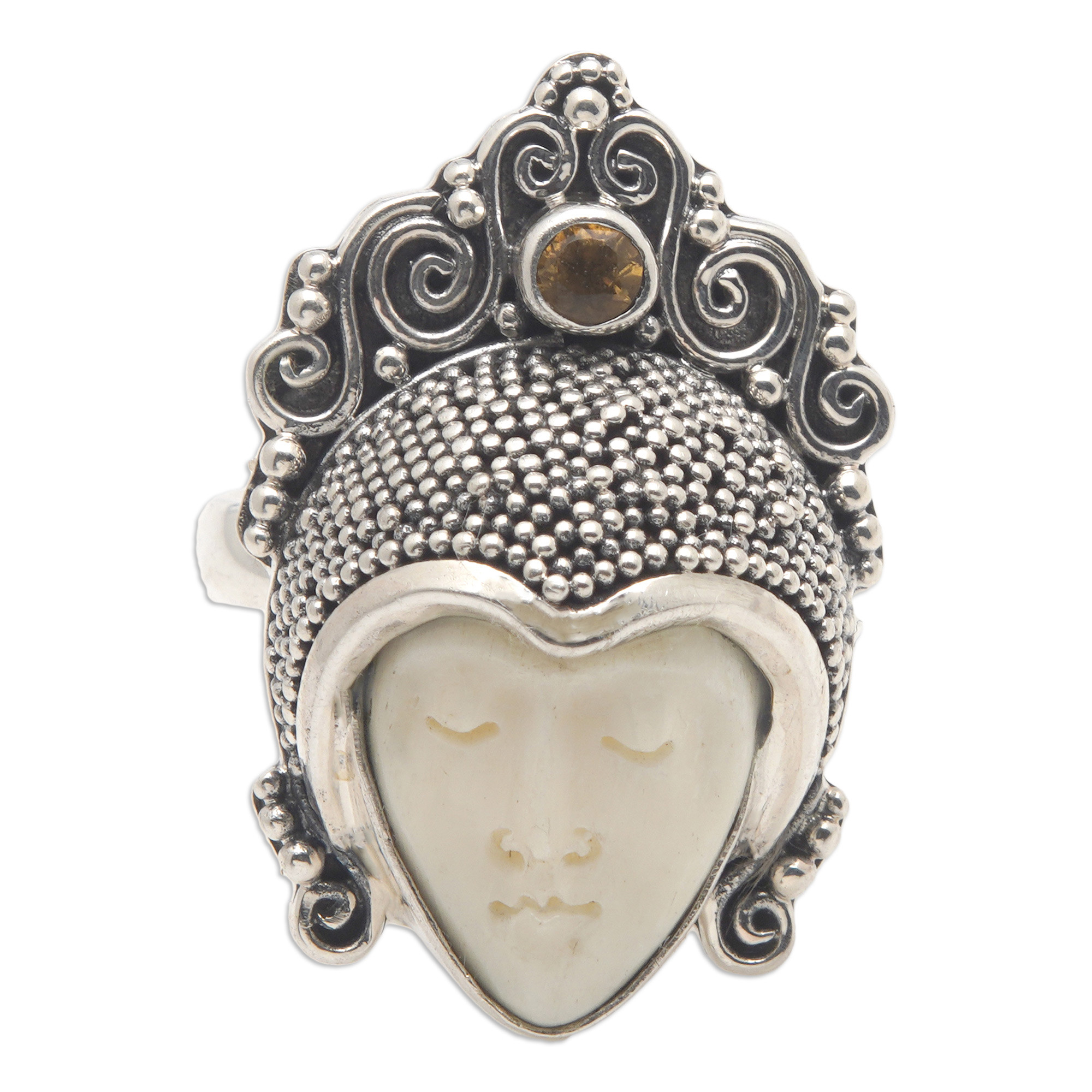 A handsome prince sleeps quietly, depicted in a ring by Buana. Carved by hand of polished bone, the young man wears a headdress of sterling globes and tendrils. He is crowned by a single citrine.