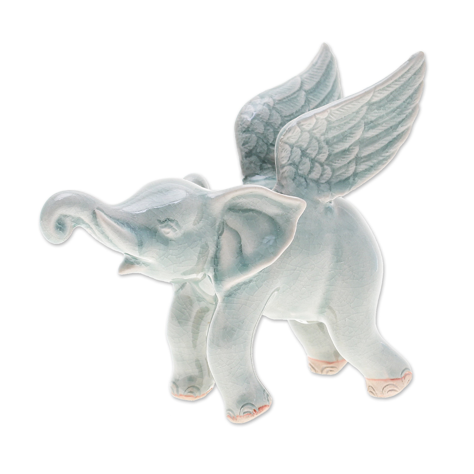 In the stunning lands of the Thai region, a mystic symbol of wisdom and divinity emerges from the talented hands of master artisan Duangkamol. Working with traditional techniques, Duangkamol handcrafts this celadon ceramic figurine, depicting a winged elephant whose bright hue and crackled finish transport you to an ethereal realm.