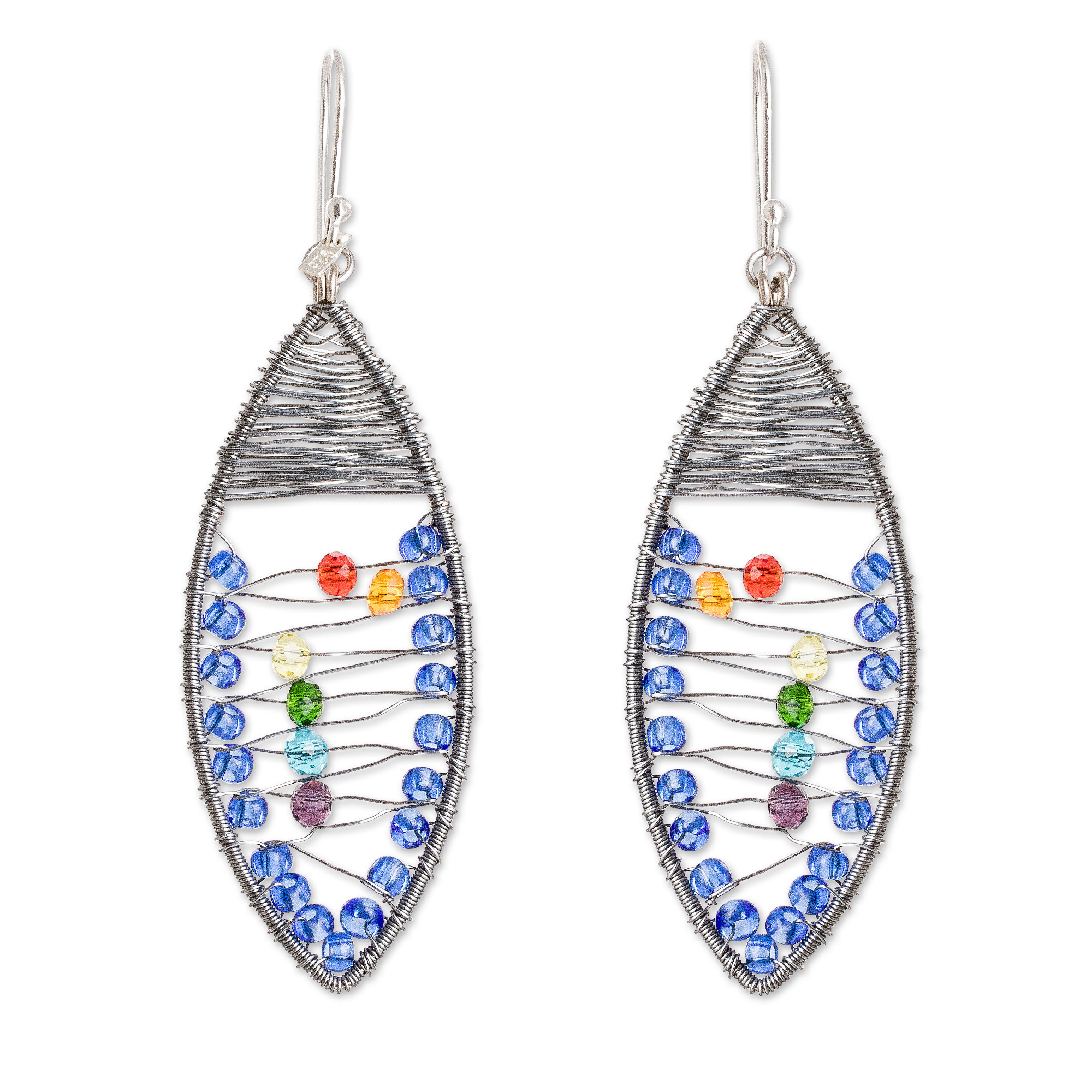 - Crystal and glass beads, stainless steel wire; 925 sterling silver hooks