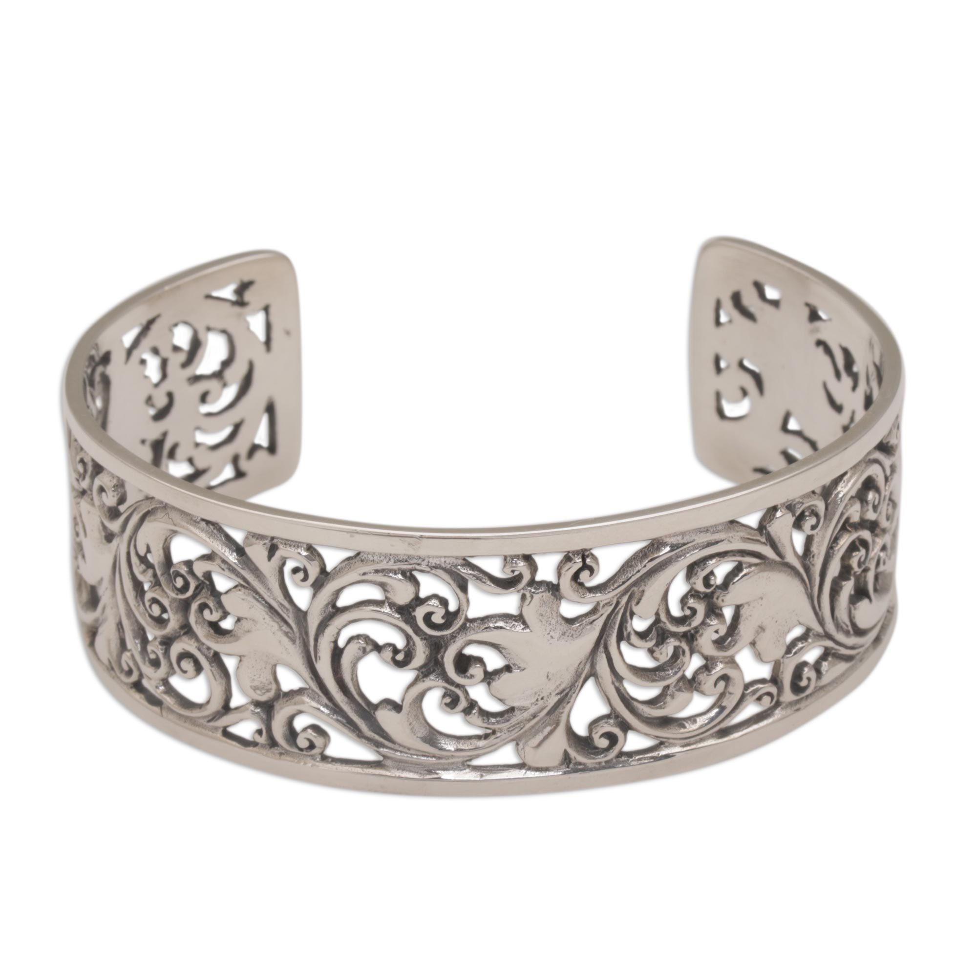 Detailed Sterling Silver Vine and Leaf Cuff Bracelet, 'Undergrowth'