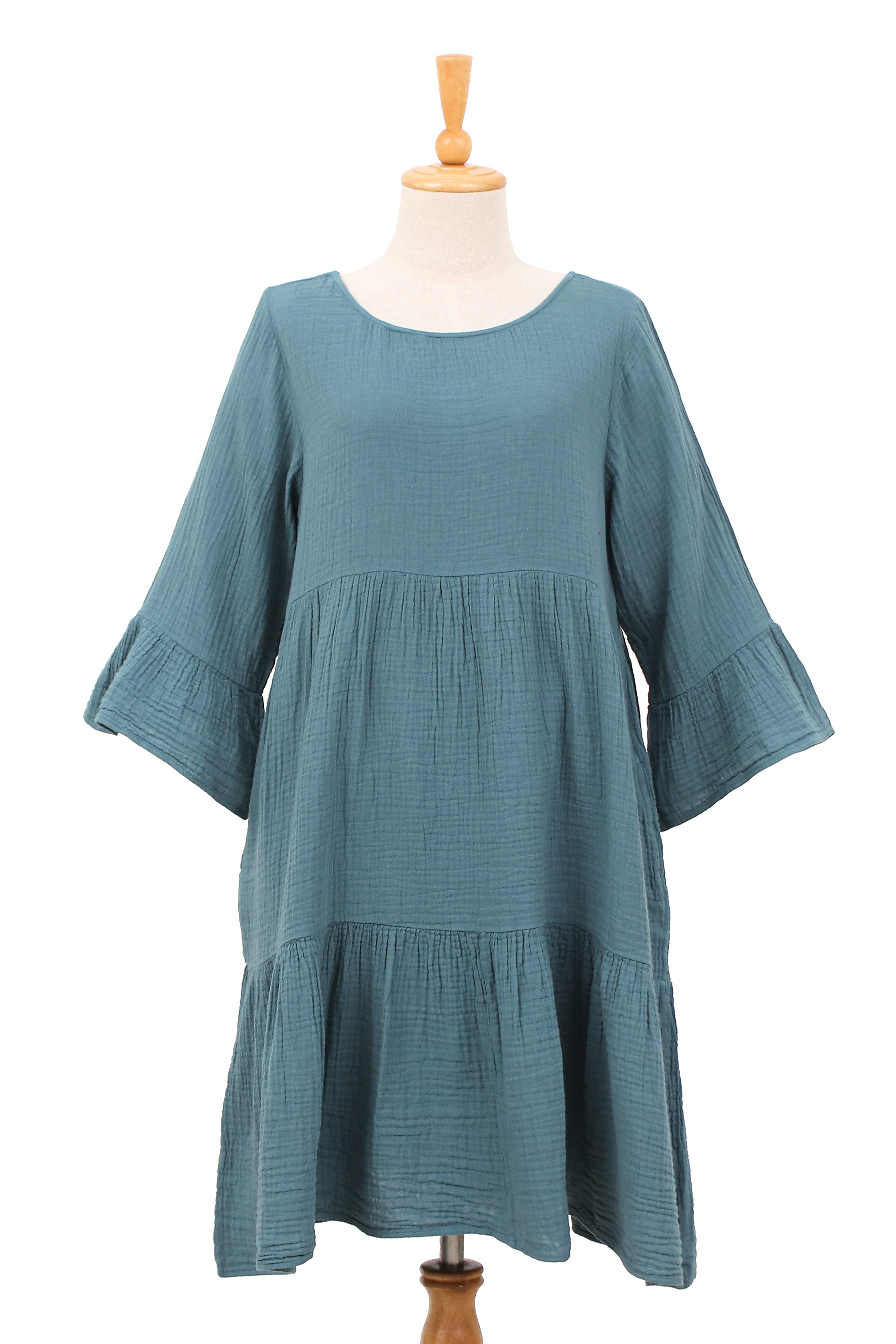 Double-Gauze Cotton Tunic Dress in a Teal Hue from Thailand, 'Teal Trends'