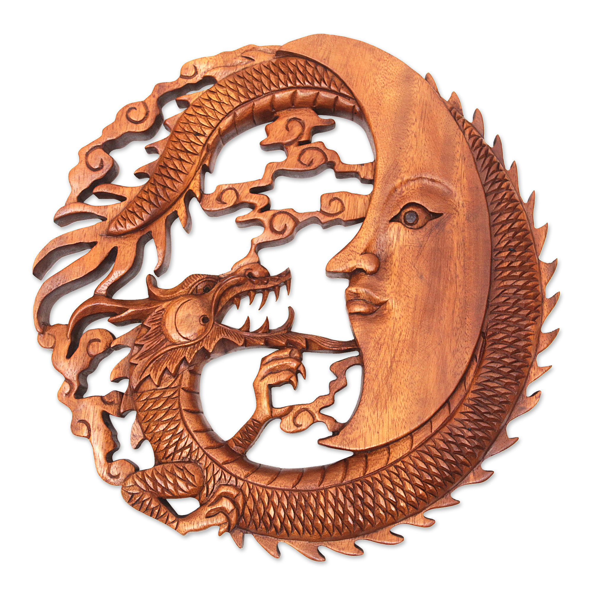 Dragon and Moon Wood Relief Panel Hand-Carved in Bali, 'Dragon Knight'