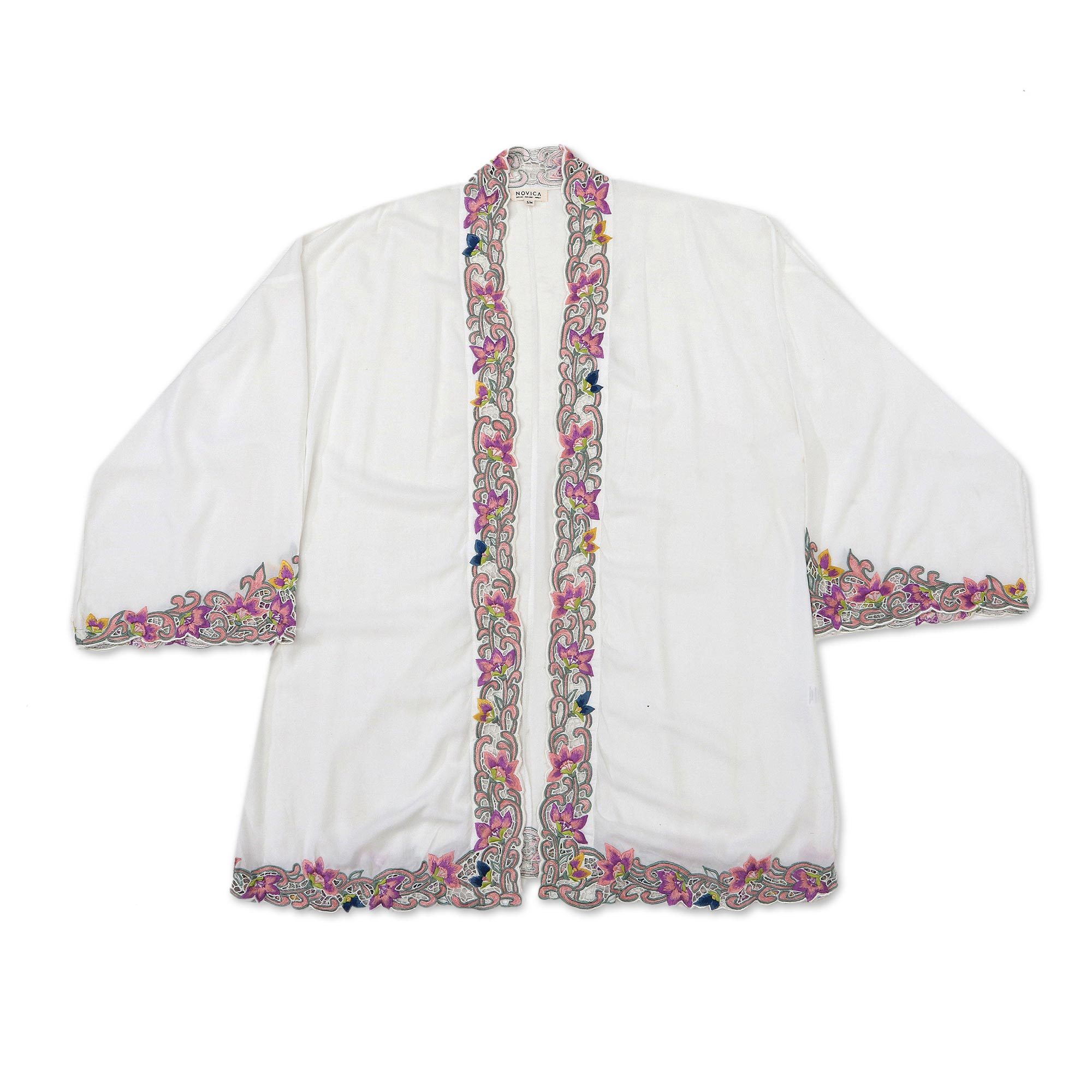 Embroidered Cotton Kimono Jacket from Bali, 'Lily Blossom in White'