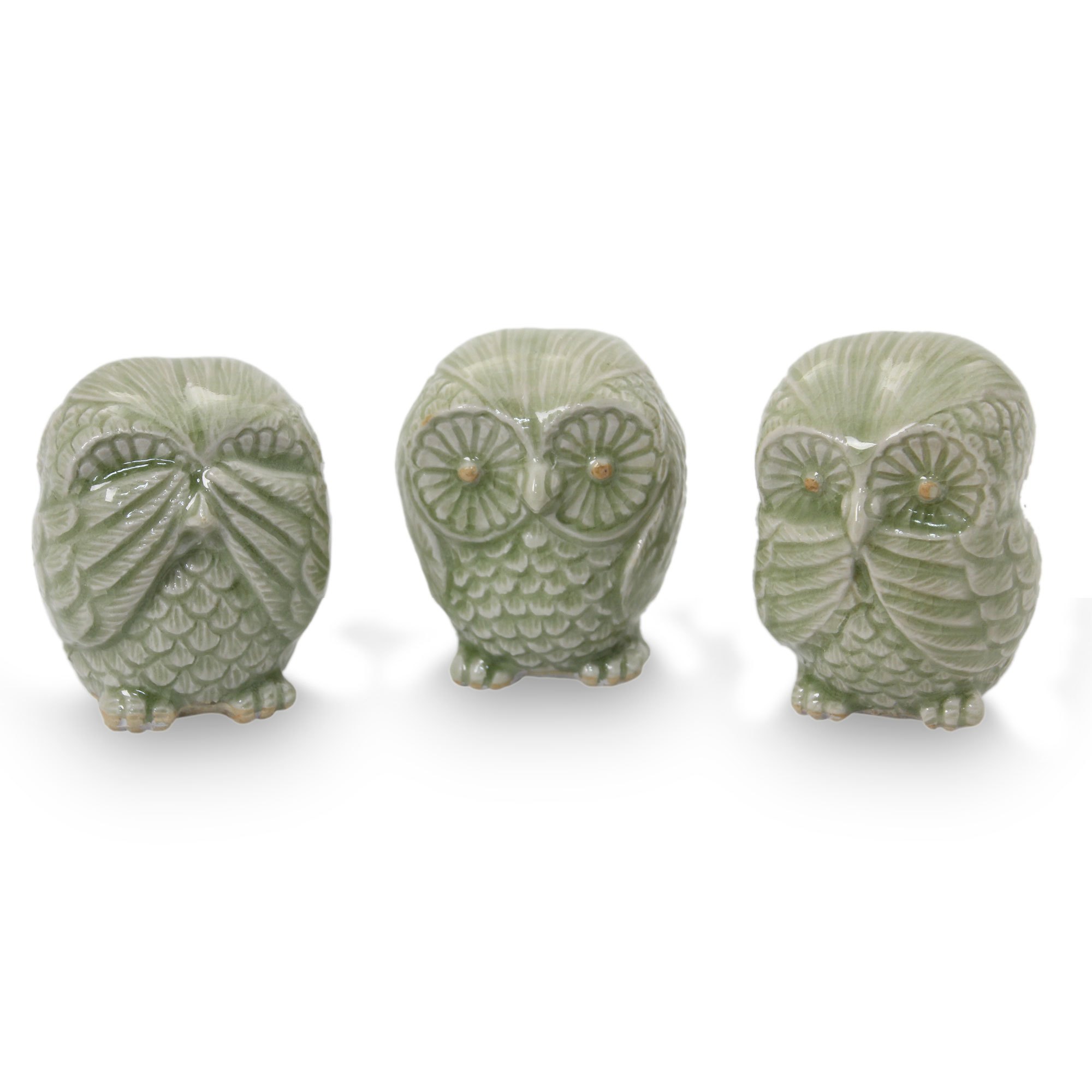 Three petite green ceramic owls recommend that we "see no evil, hear no evil, and speak no evil". Believed to have originated in ancient Japan, the old saw inspires a charming accent in this trio of statuettes.The figurines are crafted by hand and given the crackled glaze that is characteristic of celadon ceramic.