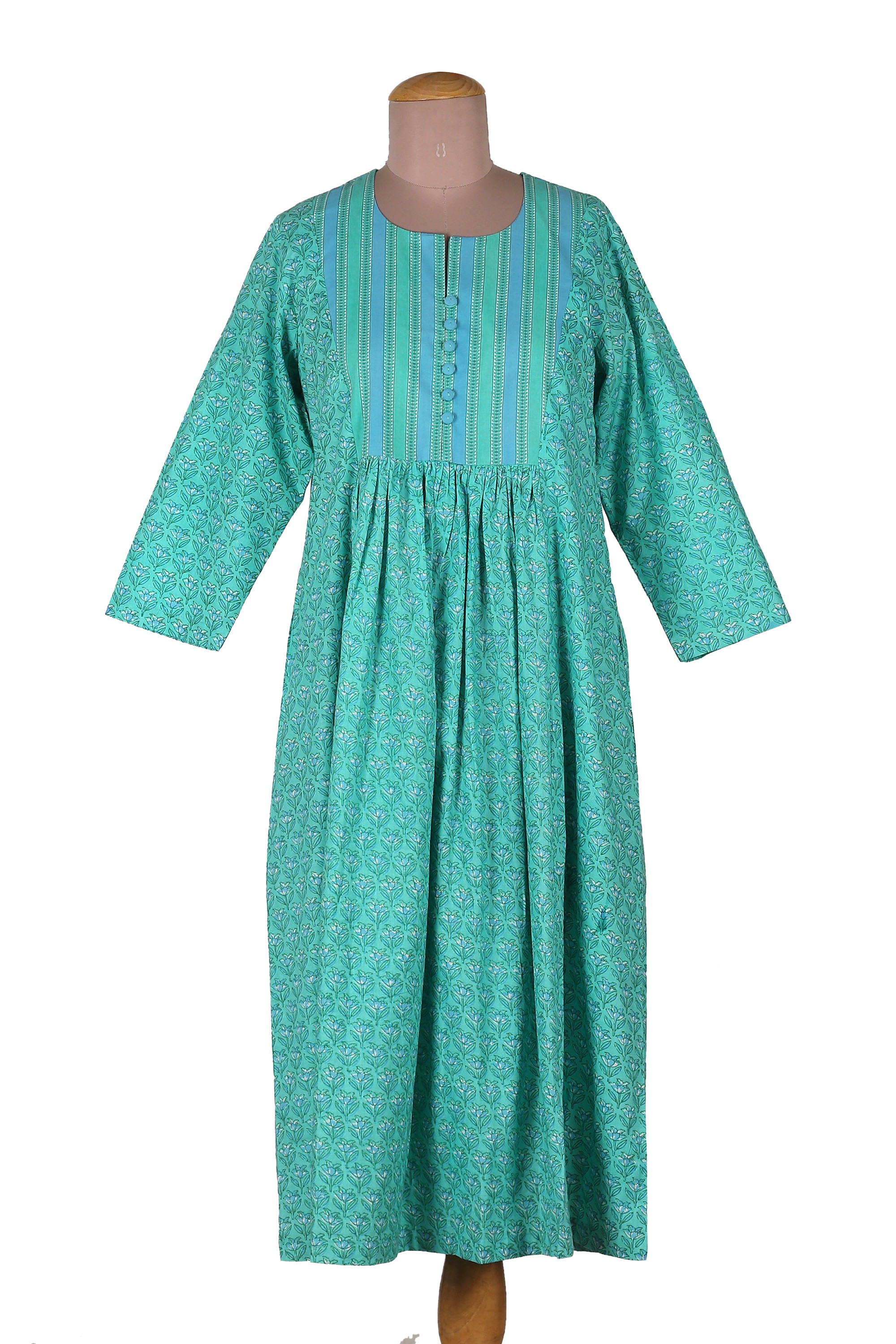 A garden of refreshing cyan, turquoise, emerald, mint and white hues gathers in this glorious a-line dress designed and crafted by Una Gupta of India. The artist uses cotton textiles to allow the garment to boast a lightweight and flowing sensation complemented by three-quarter sleeves and a button-up bodice with a striped pattern. Accented with flowers, the piece also has pockets.