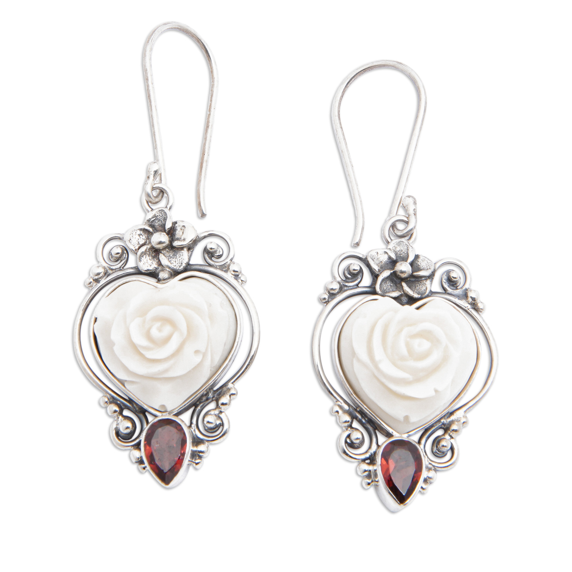 Floral Heart-Shaped Natural Garnet Dangle Earrings from Bali, 'Valentine Sensations'