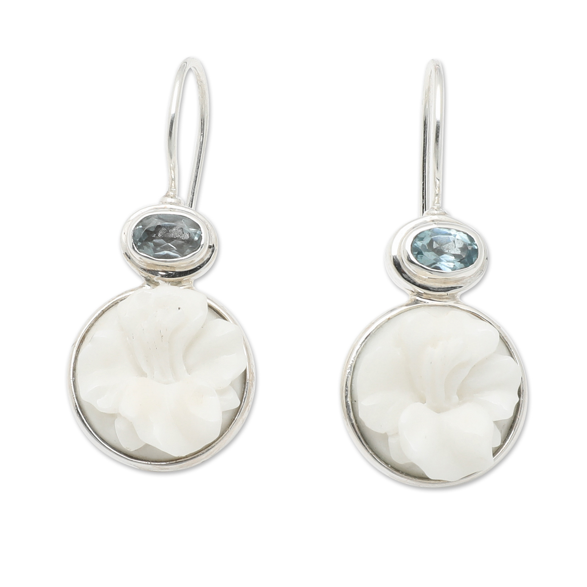 The hibiscus flower, a symbol of beauty and glory, inspires Buana's newest creation, showing the world the splendor of the Balinese region. Using advanced metalworking techniques, the artisan crafts these dangle earrings' structure from sterling silver in a high-polish finish. The gorgeous blooms dangling at the bottom are made from carved bone, displaying an ethereal white light. Finally, faceted blue topaz stones in an oval shape crown Buana's creation with serenity while representing loyalty.
