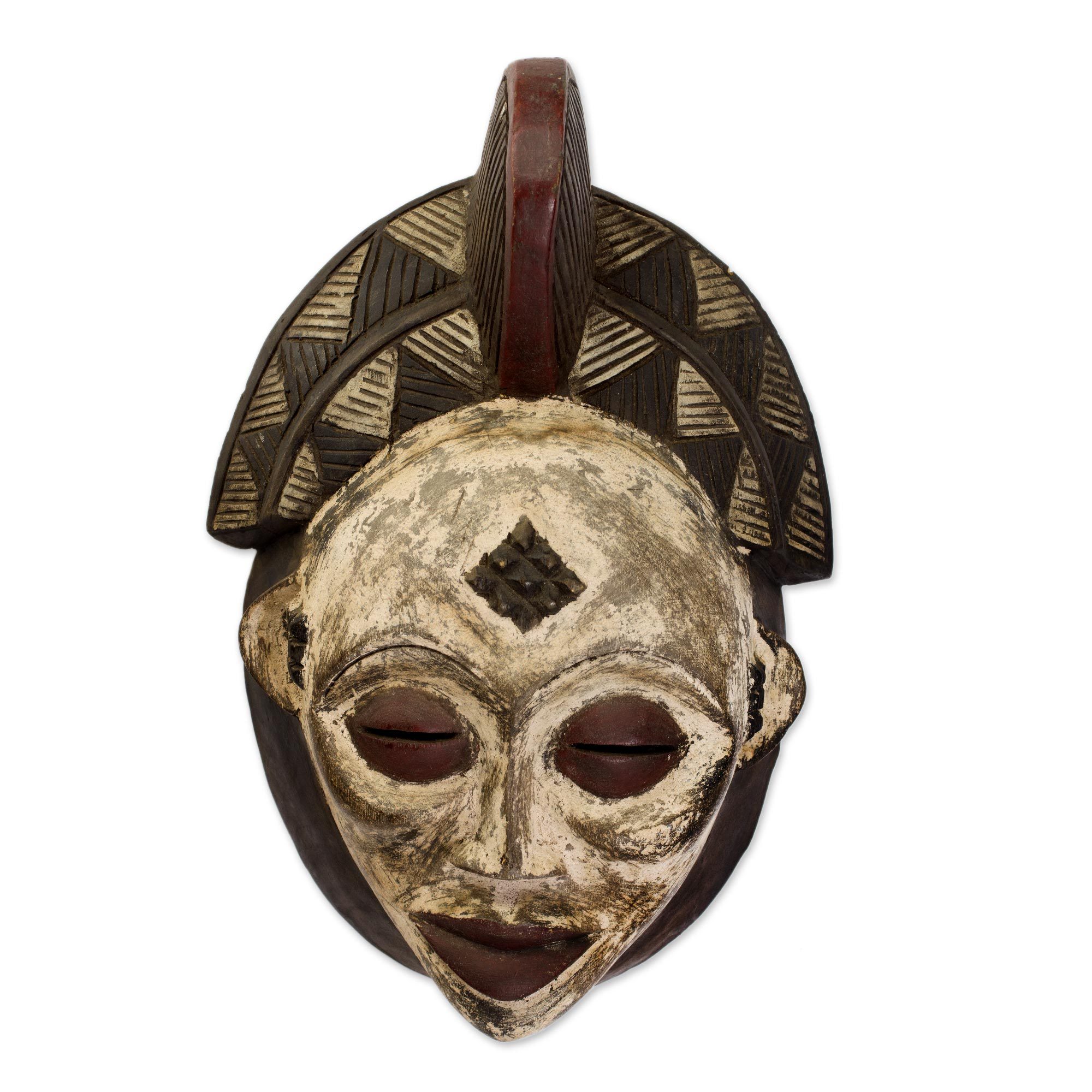 A faithful replica of the renowned "White Masks of the Ogooue," this mask personifies an ancestral spirit of the Kota and Mukudji people from Gabon. Known as "Punu," the ancestral spirit is believed to guide one to the hereafter; Punu masks are reserved for important village festivities. Salihu Ibrahim hand-carves the mask of sese wood featuring half-opened eyes and slightly raised pursed lips. The forehead is embellished with a distinct diamond-shaped motif. The face is surrounded by a patterned halo. Once the mask is carved and the wood has dried thoroughly dried, it is treated with clay to appear like an antique piece.