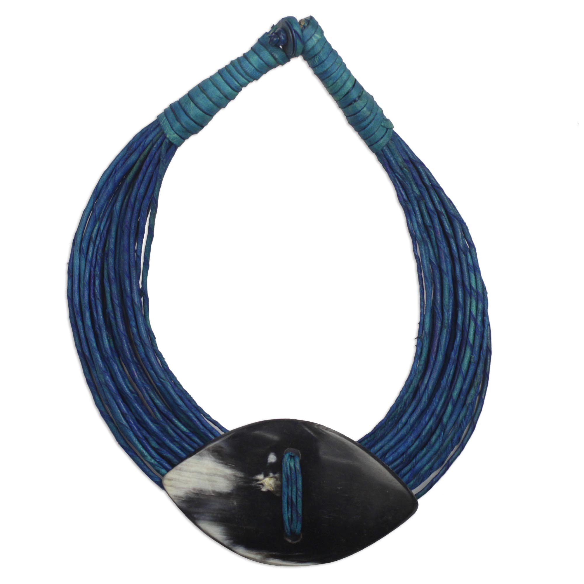 Ila Suleyman inherited his passion for jewelry making from his grandfather, who taught him how to work with natural leather from a young age in Ghana. He crafts the stunning statement necklace by hand with supple royal blue leather, centering the bold accessory with a natural oval pendant. "Although I introduce modernity in my designs, they are finished as timeless pieces to be cherished for generations," says Ila who calls his design Masongo, a Mamprusi word meaning "good mother."