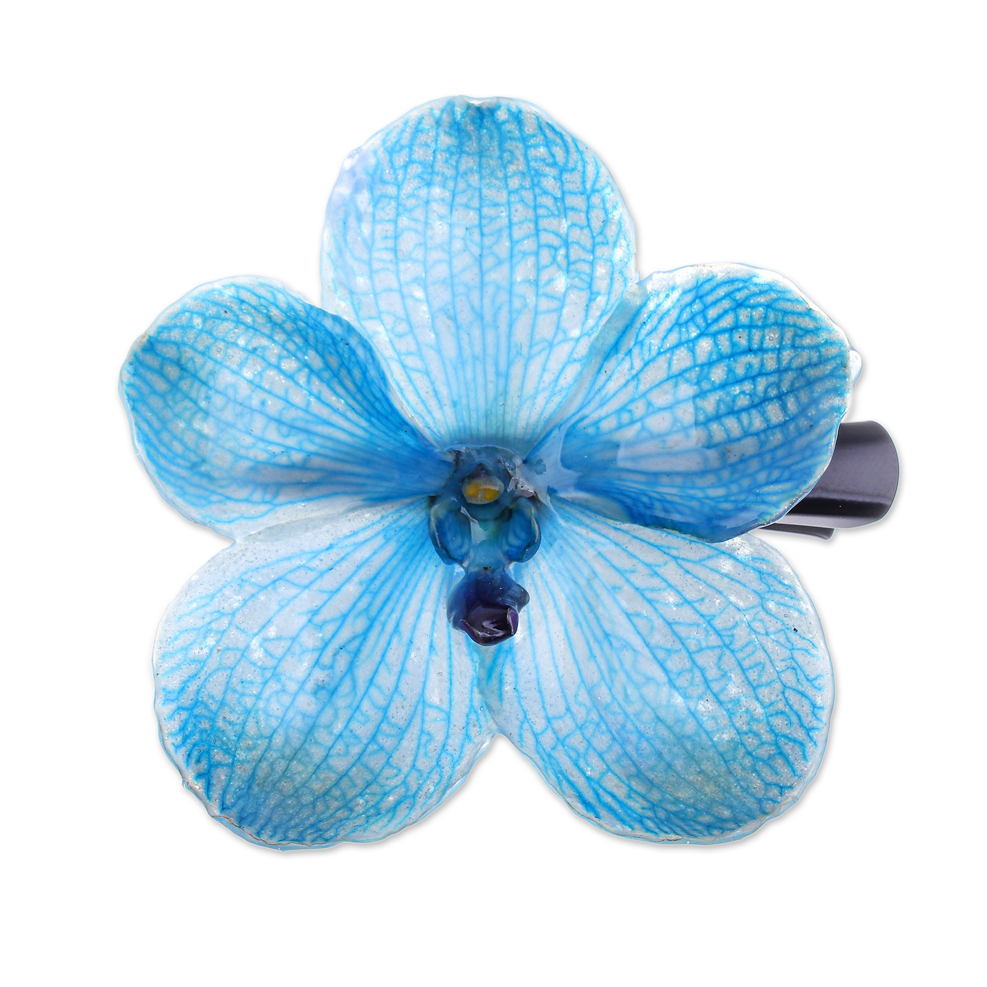 Glossy Resin-Coated Blue Natural Orchid Metallic Hair Clip, 'Blue Whisper'