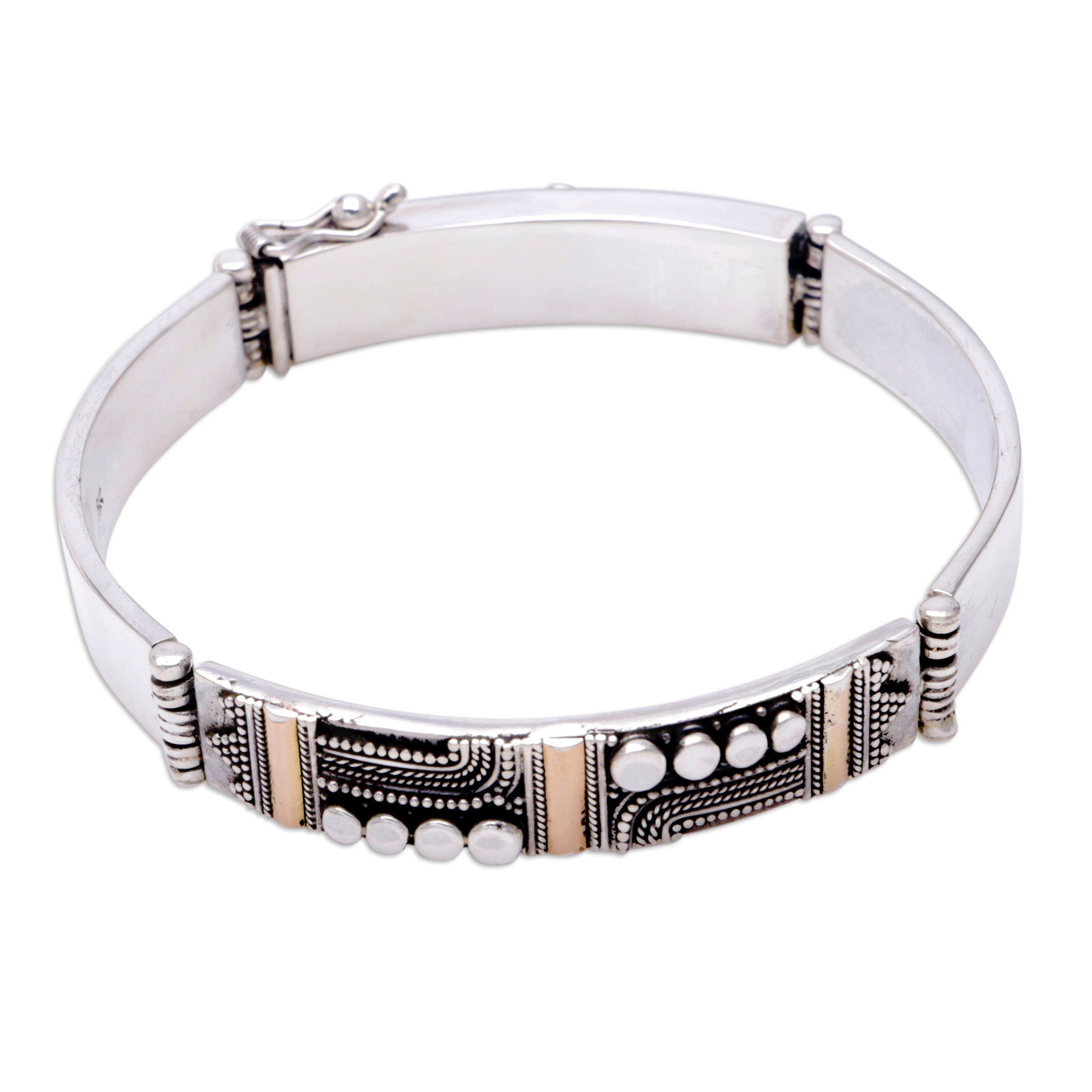 This bracelet radiates pure Balinese elegance. Wayan Asmana designs the piece with detailed imagery. Featuring gold-plated accents, this bracelet is set to accessorize with Balinese chic.