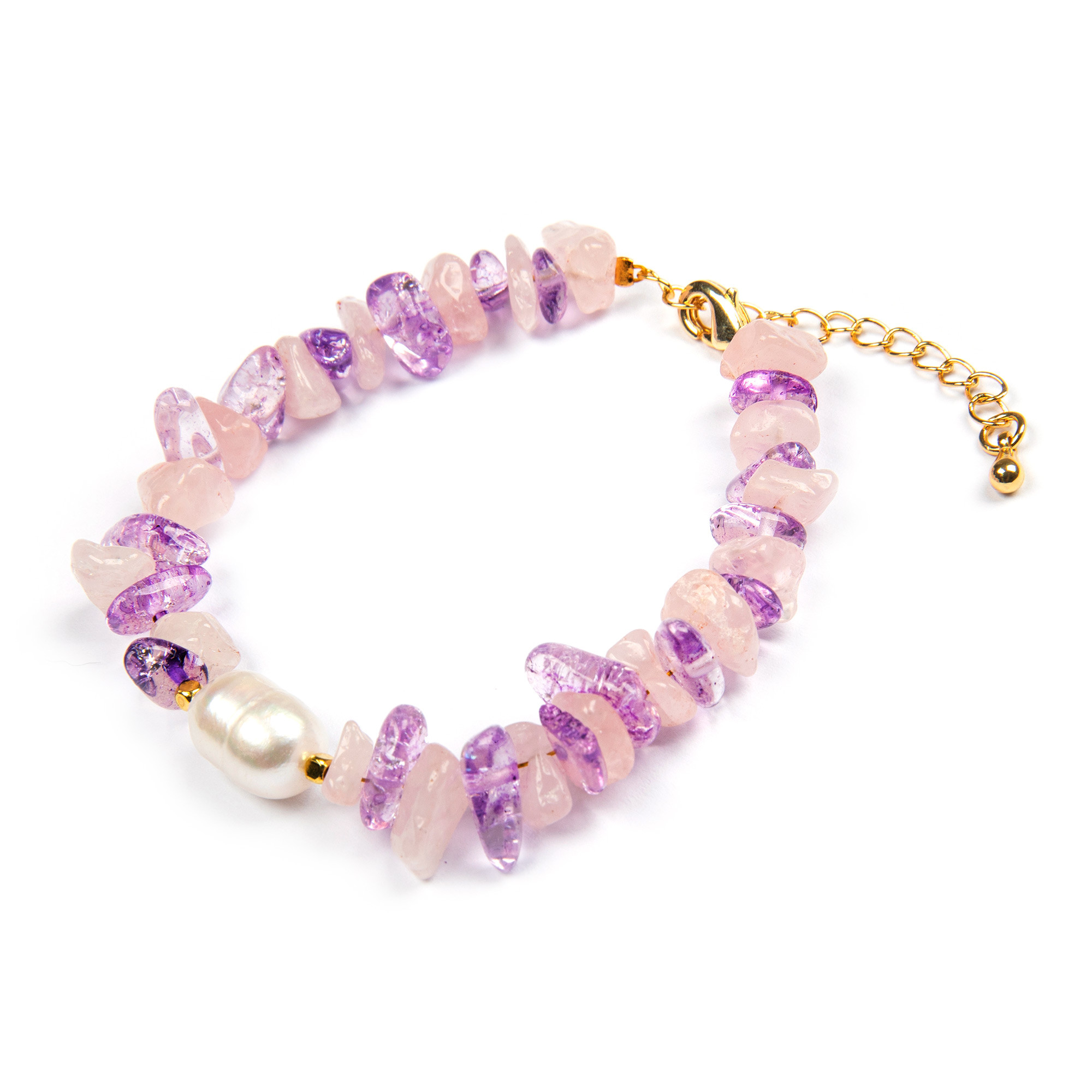 - Rose quartz, amethyst, freshwater cultured pearl; 18k gold-plated brass