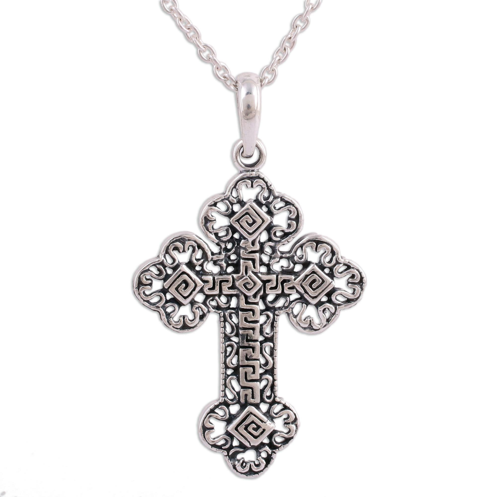 Sterling silver cross pendant necklace, 'Key to Heaven' - Greek Key Motif Sterling Silver Cross Pendant Necklace
