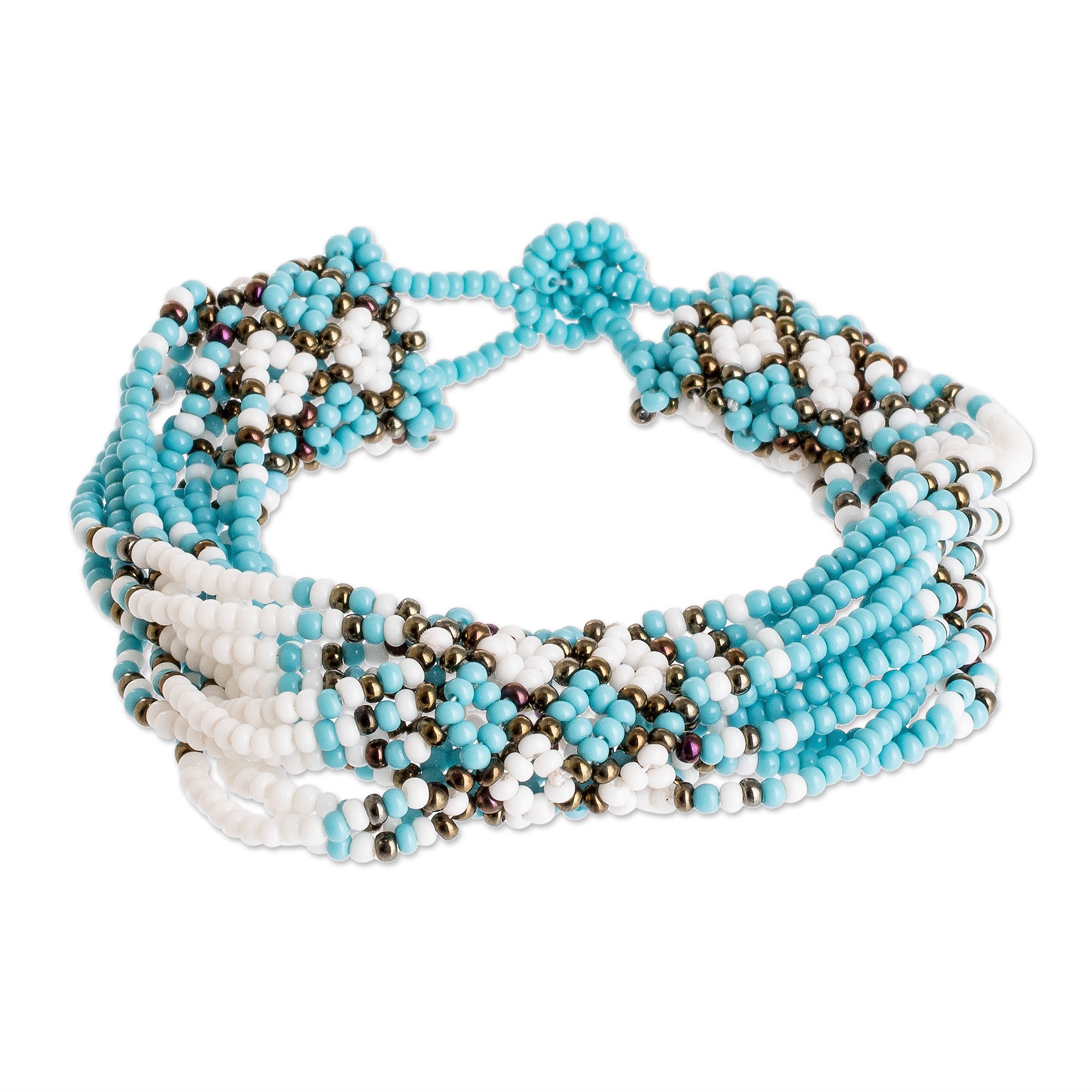 Hand Beaded Bracelet from Guatemala, 'Flower Harmony in Turquoise'