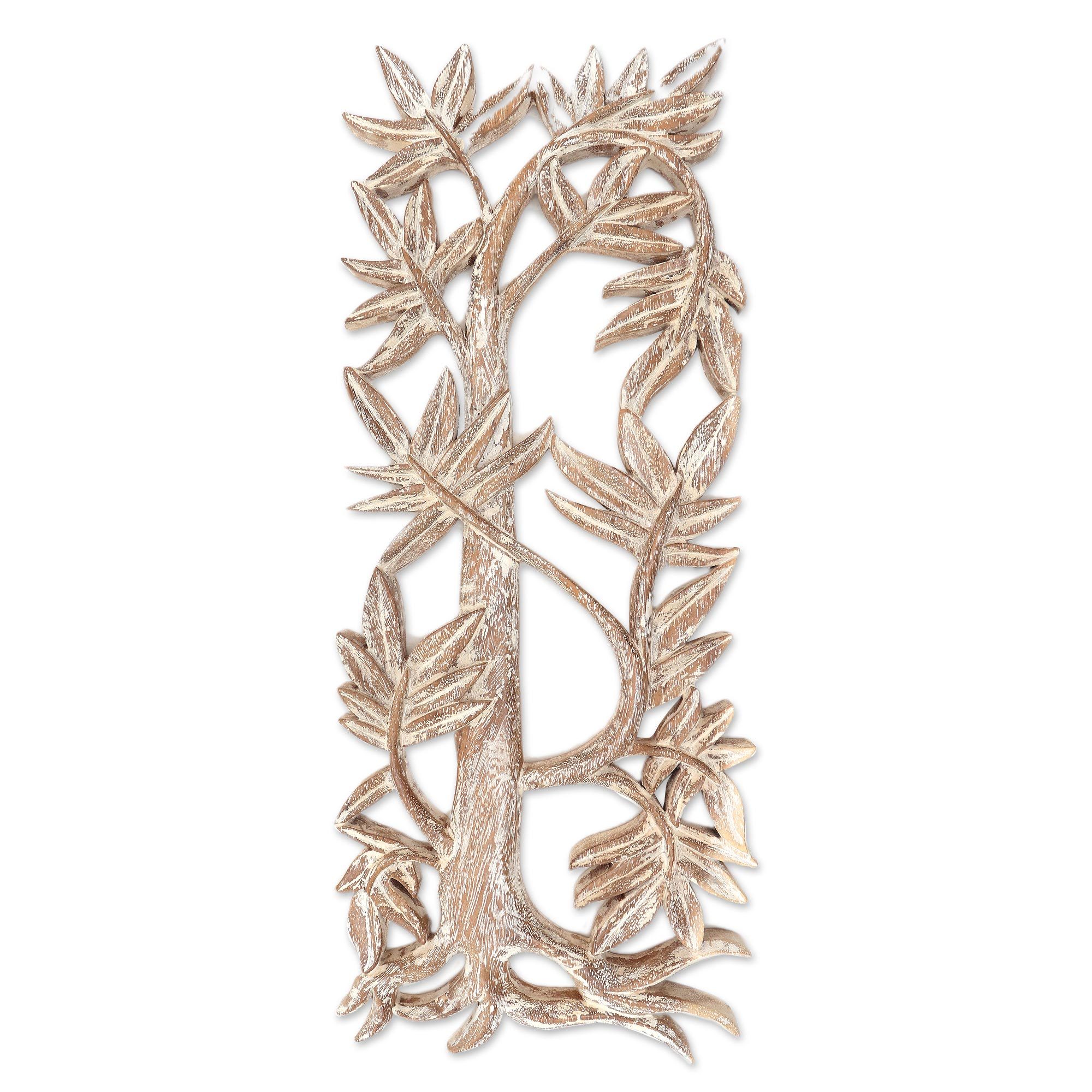 Hand Carved Suar Wood Leaf-Motif Relief Panel, 'Growing Bamboo'