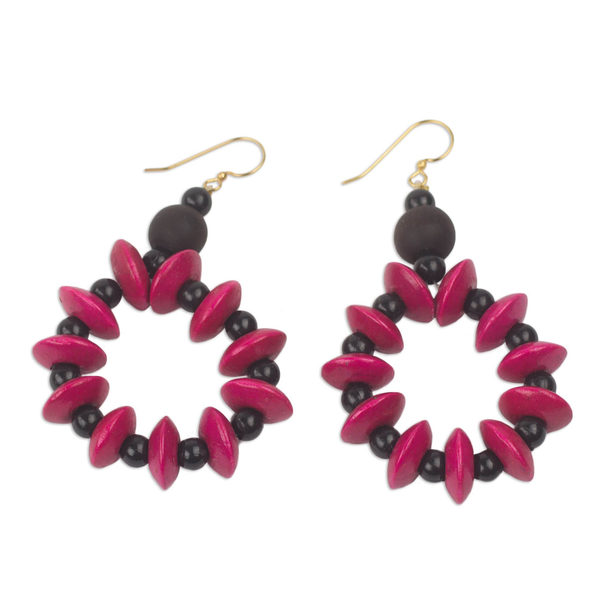 Wood dangle earrings, 'Bloom in Magenta' - Hand Crafted Sese Wood Dangle Earrings from Ghana