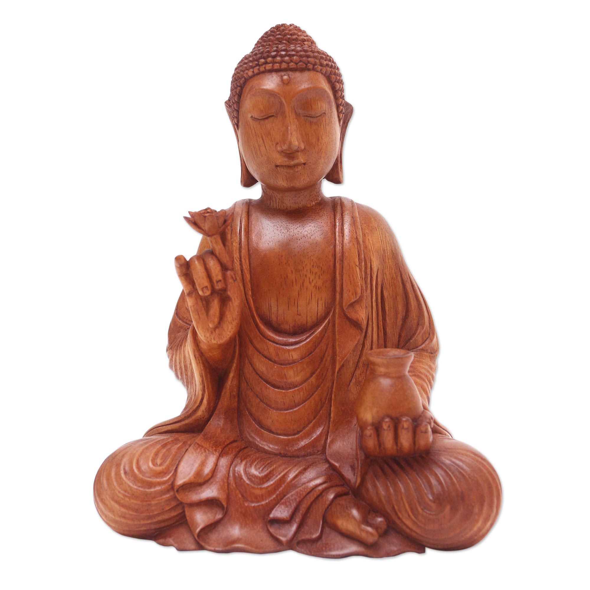 Hand Made Suar Wood Buddha Sculpture, 'Holy Pitcher'