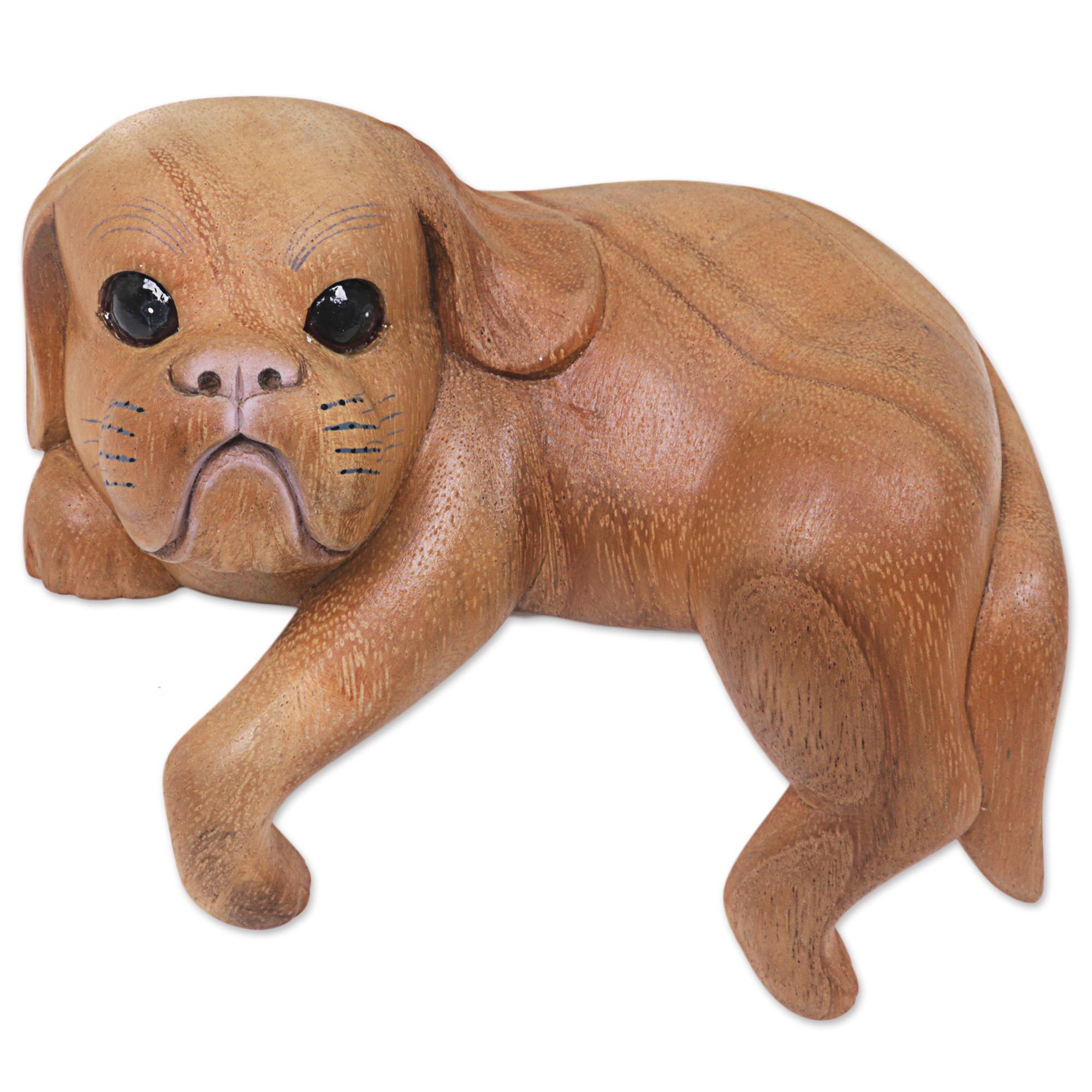 Hand Made Wood Dog Sculpture Natural Finish from Indonesia, 'Curious Shih Tzu'