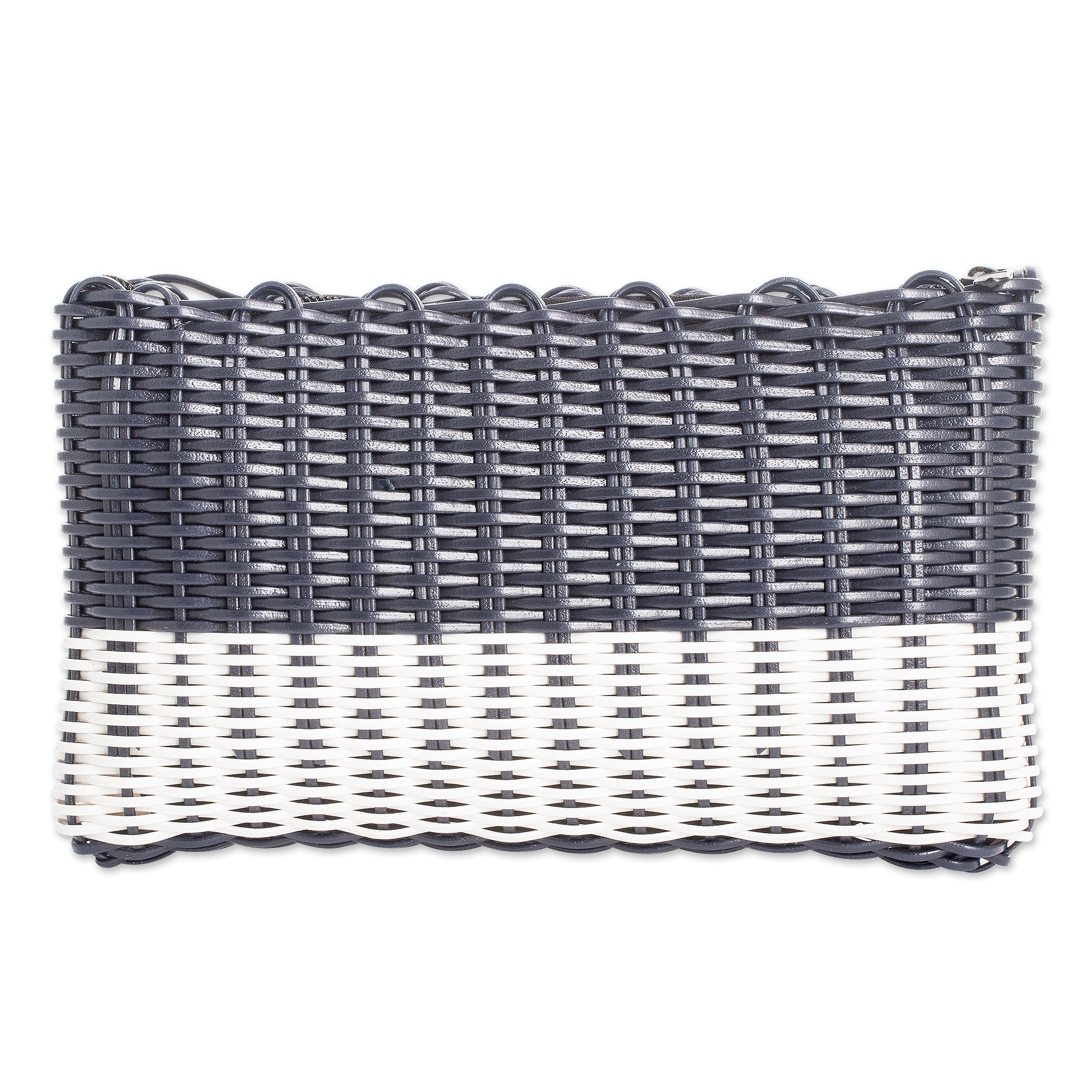 Hand-Woven Recycled Vinyl Cord Cosmetic Bag in Blue & White, 'Navy over White'