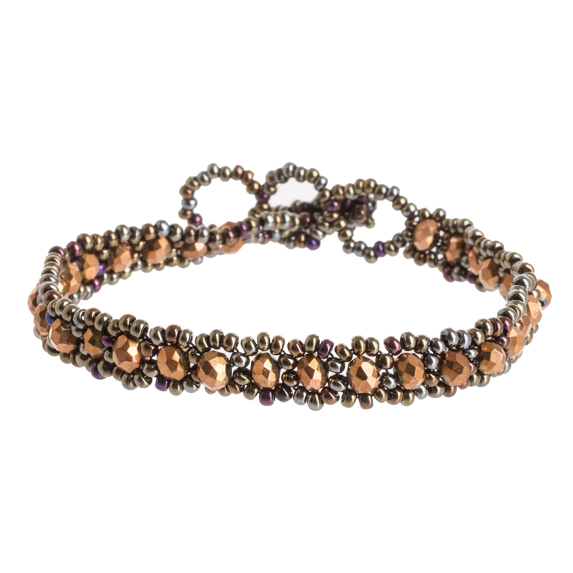 Handcrafted Bronze Glass and Crystal Beaded Bracelet, 'Magical Whispers in Bronze'