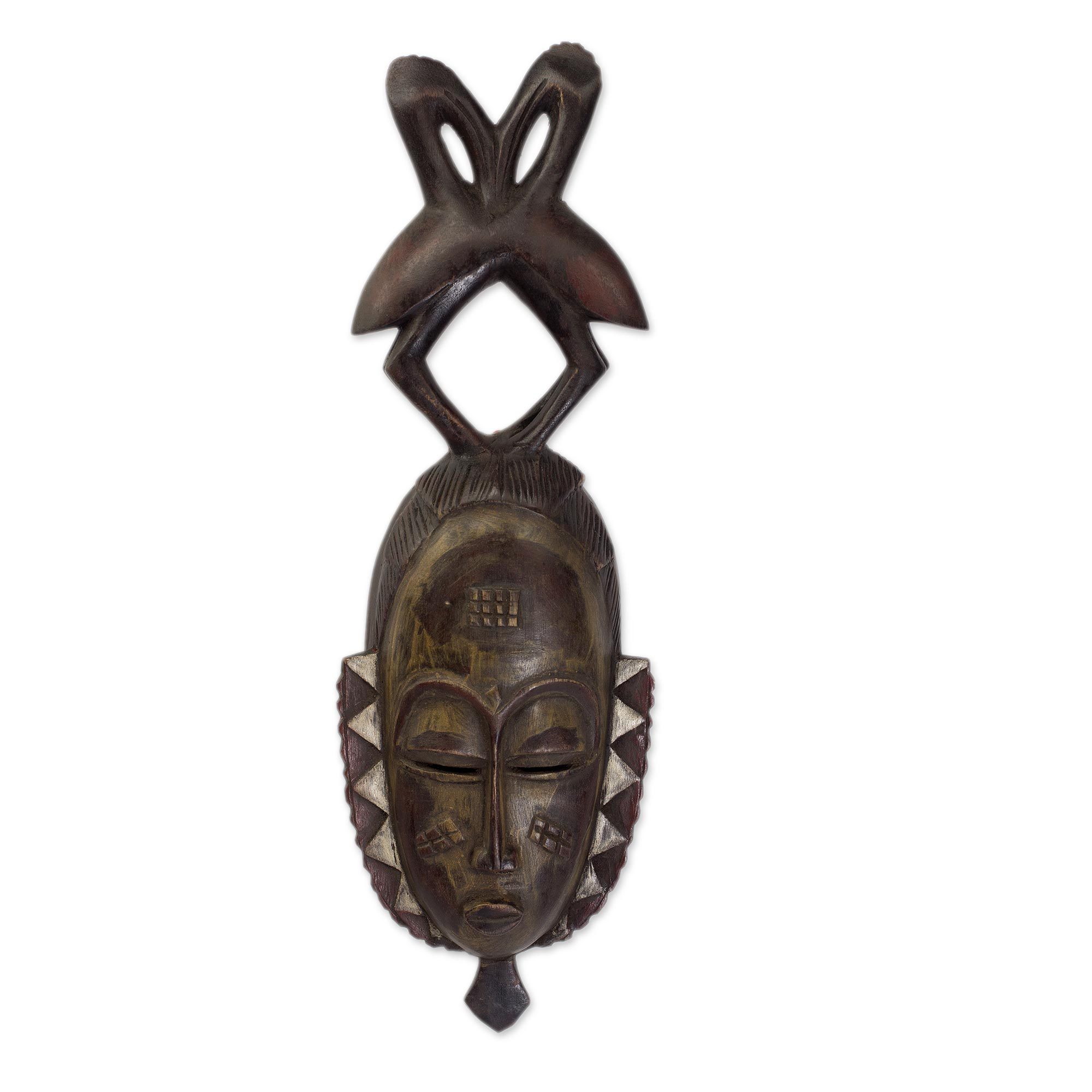 To the Yaure people of Cote d'Ivoire this mask symbolizes togetherness. Carved of sese wood, a face of solemn features is crowned with the image of two birds face-to-face. Salihu Ibrahim crafts this replica by hand, and as the birds' beaks come into contact their bodies outline a heart.
