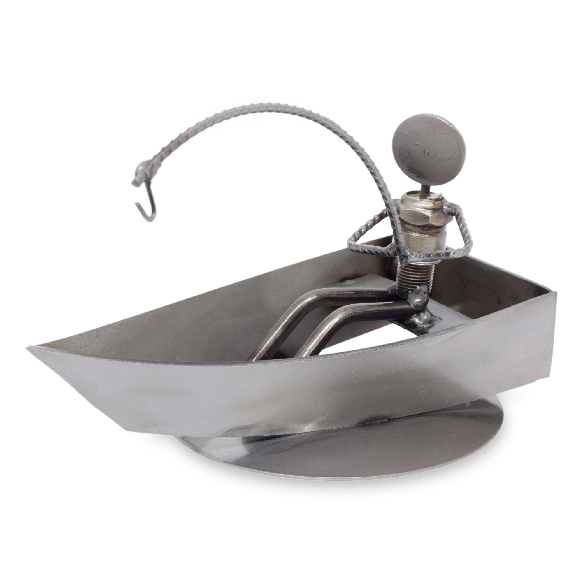 Handcrafted Recycled Metal Fisherman Sculpture, 'Rustic Fisherman'