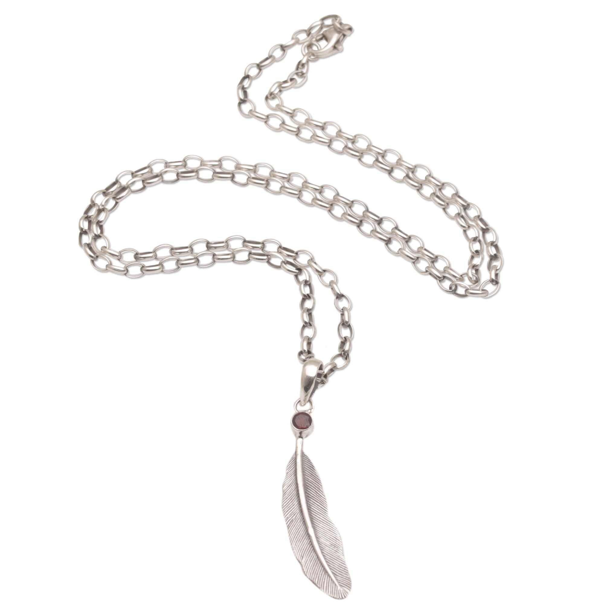 Handmade 925 Sterling Silver Garnet Pendant Feather Necklace, 'Fleeting Feather'