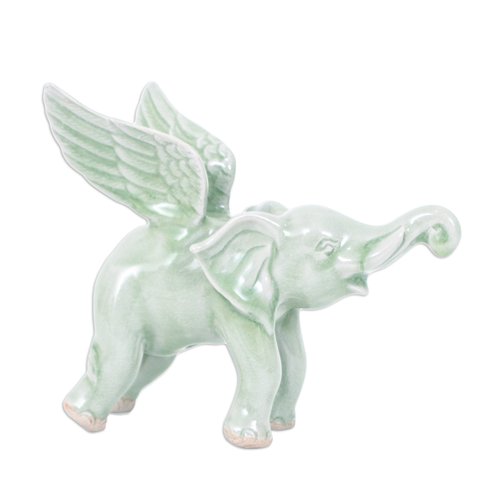Let this regal winged elephant figurine from Thailand's Duangkamol transport you to a magical realm. Expertly handcrafted using time-honored celadon ceramic techniques, this ethereal elephant combines Thailand's revered national symbol with imaginative whimsy. Its crackled jade glaze and gracefully uplifted wings evoke mythic elegance and flight, making it a singular work of artisan mastery that will brighten up any space.