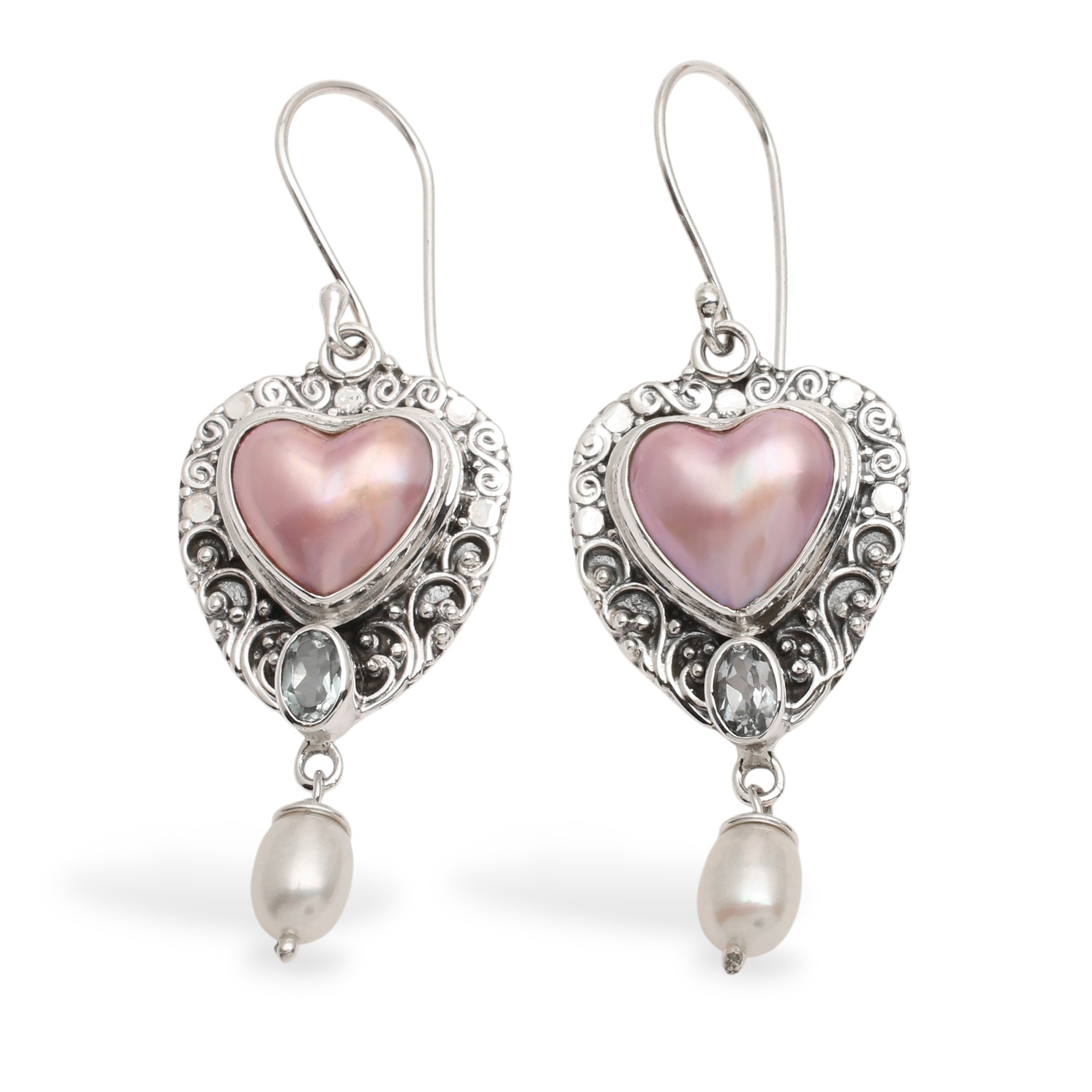 Romance blooms in sterling silver with these enchanting dangle earrings that celebrate devotion through artful design. Artisan Buana's masterful creation showcases heart-shaped pink cultured mabe pearls nestled within distinguished Balinese folk art details, while sparkling blue topaz stones and lustrous white oval cultured pearls dance below in perfect harmony. These precious accessories transform loyal love into tangible beauty, where each gemstone tells its own story of eternal affection.