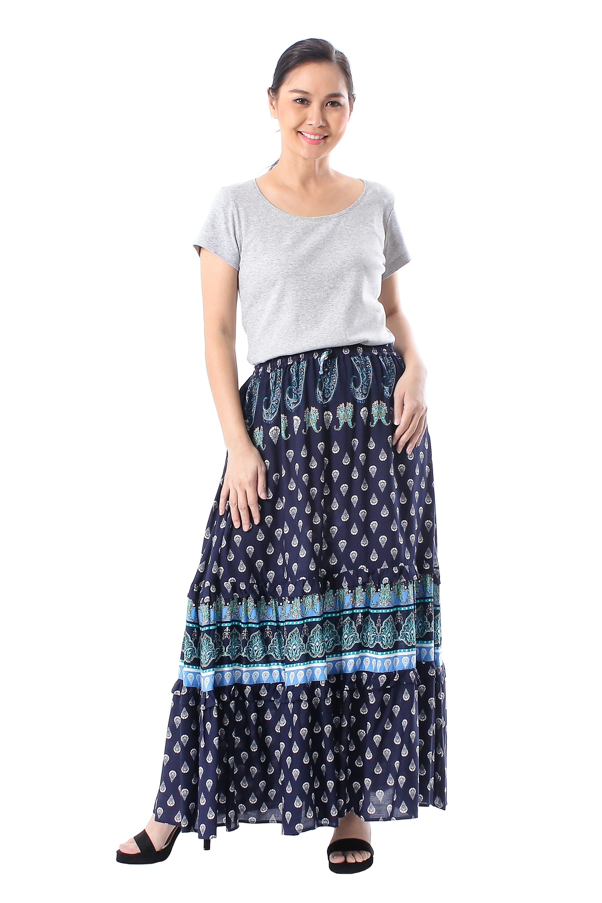 Indigo Paisley Motif Rayon Skirt Crafted in Thailand, 'Tender Paisleys'