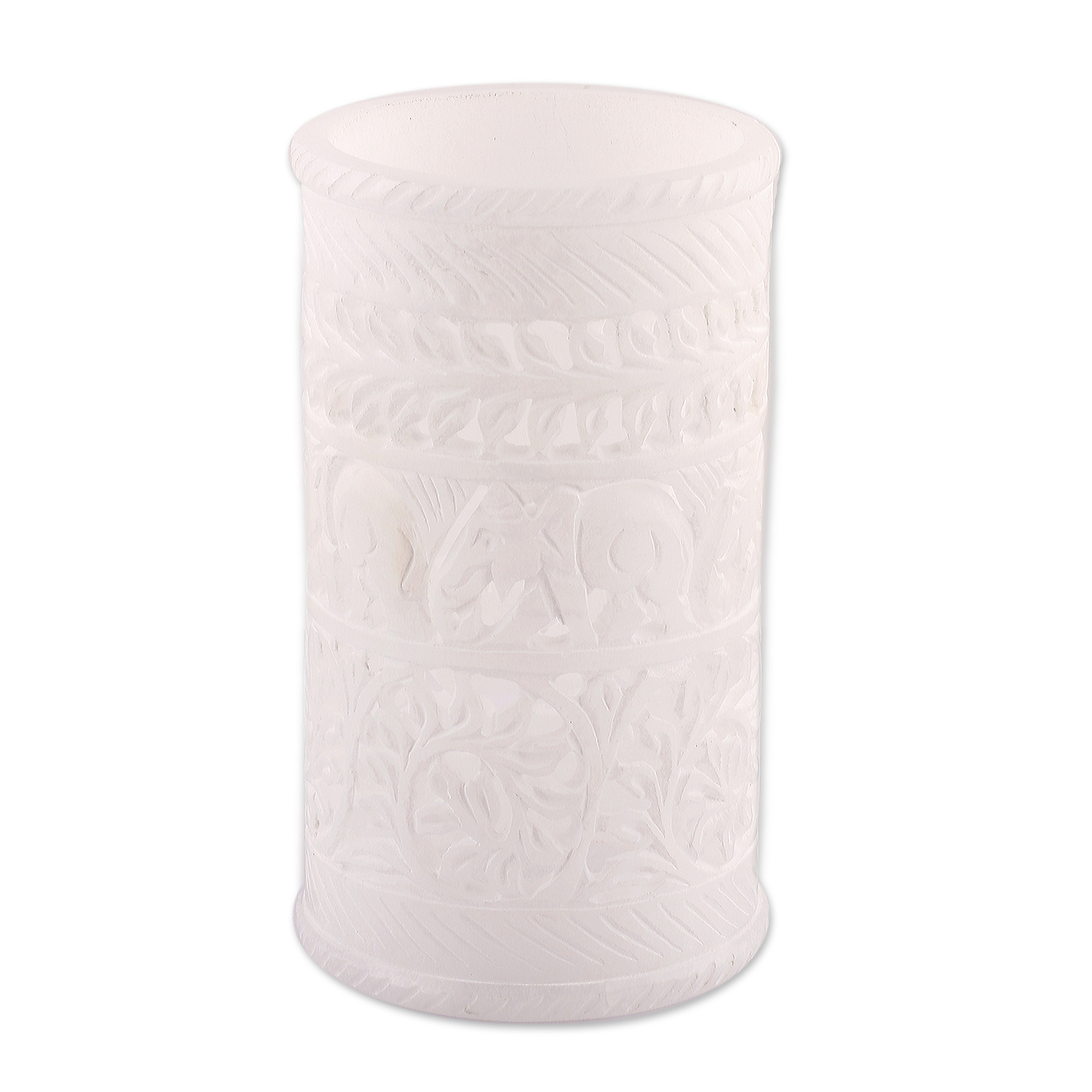 Jali Openwork Elephant Leaf-Themed Alabaster Decorative Vase, 'Elephant March'