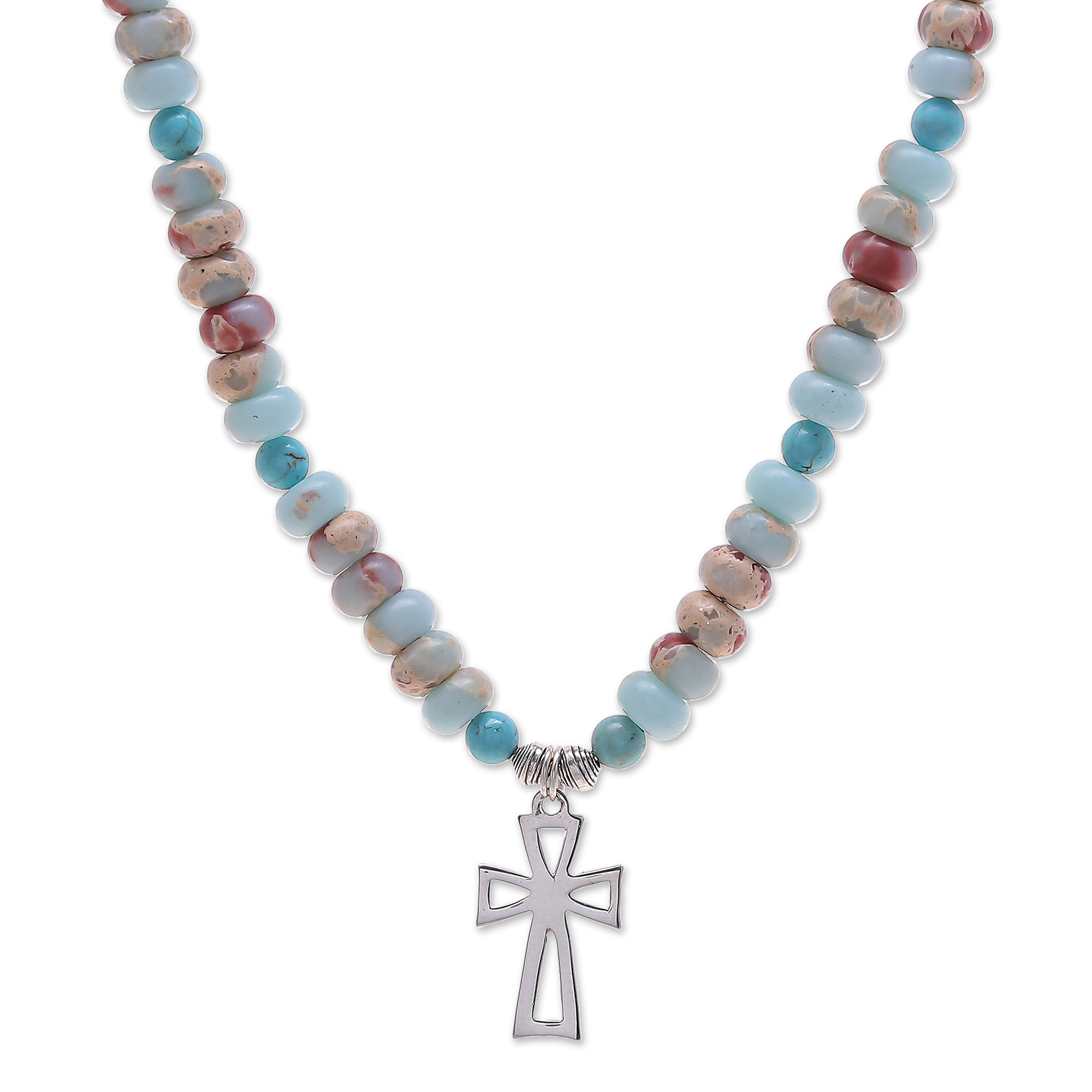 Jasper and Variscite Beaded Necklace with Cross Pendant, 'Wealth & Faith'